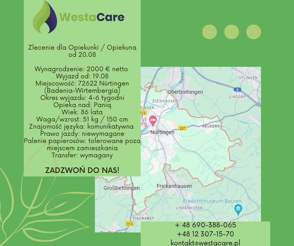 Zlecenie dla Opiekunki / Opiekuna od 20.08 2000 € netto