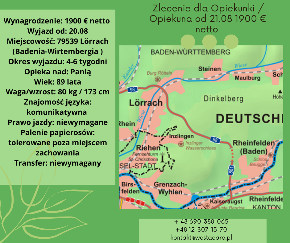 Zlecenie dla Opiekunki / Opiekuna od 21.08 1900 € netto
