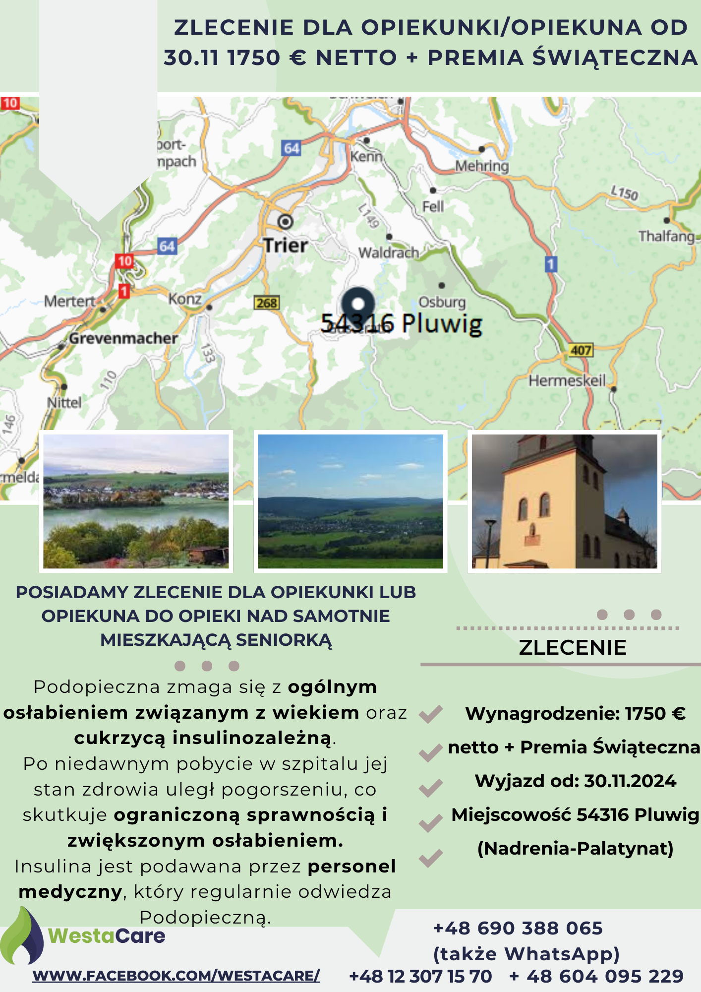 Zlecenie dla Opiekunki/Opiekuna od 30.11 1750 € netto + Premia Świąteczna