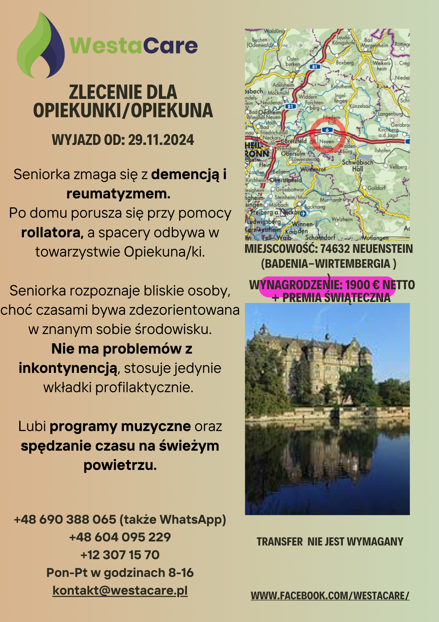 Zlecenie dla Opiekunki/Opiekuna od 29.11 1900 € netto + Premia Świąteczna
