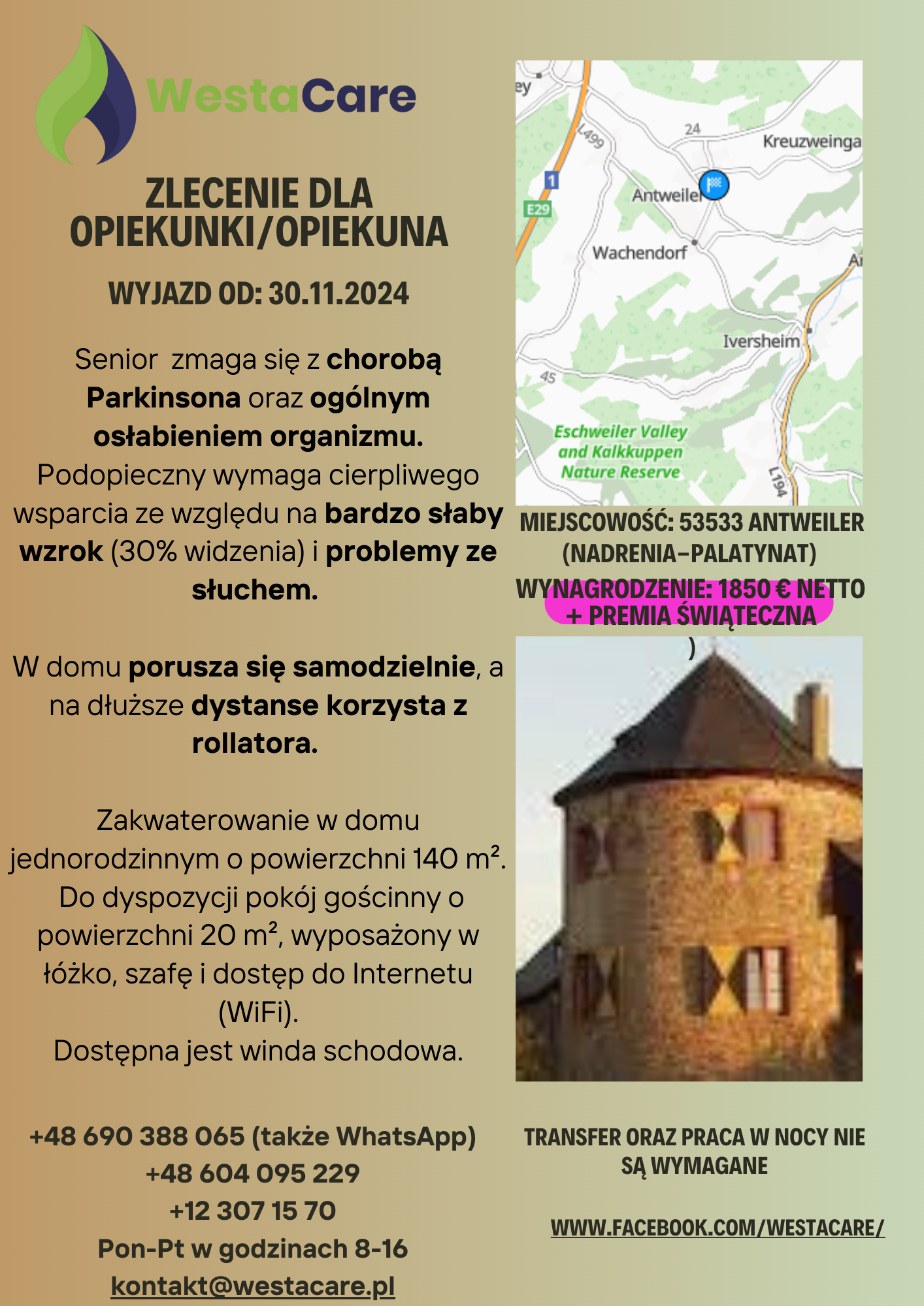 Zlecenie dla Opiekunki/Opiekuna od 30.11 1850 € netto + Premia Świąteczna