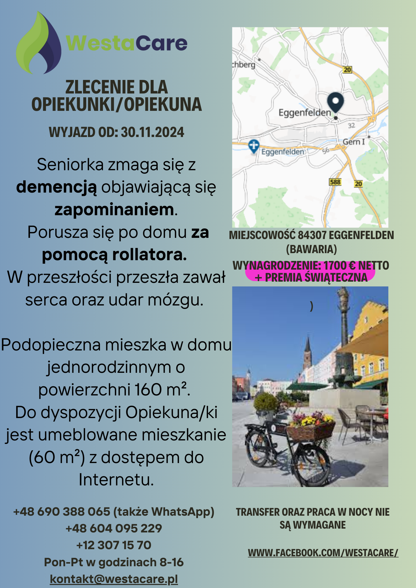 Zlecenie dla Opiekunki/Opiekuna od 30.11 1700 € netto + Premia Świąteczna