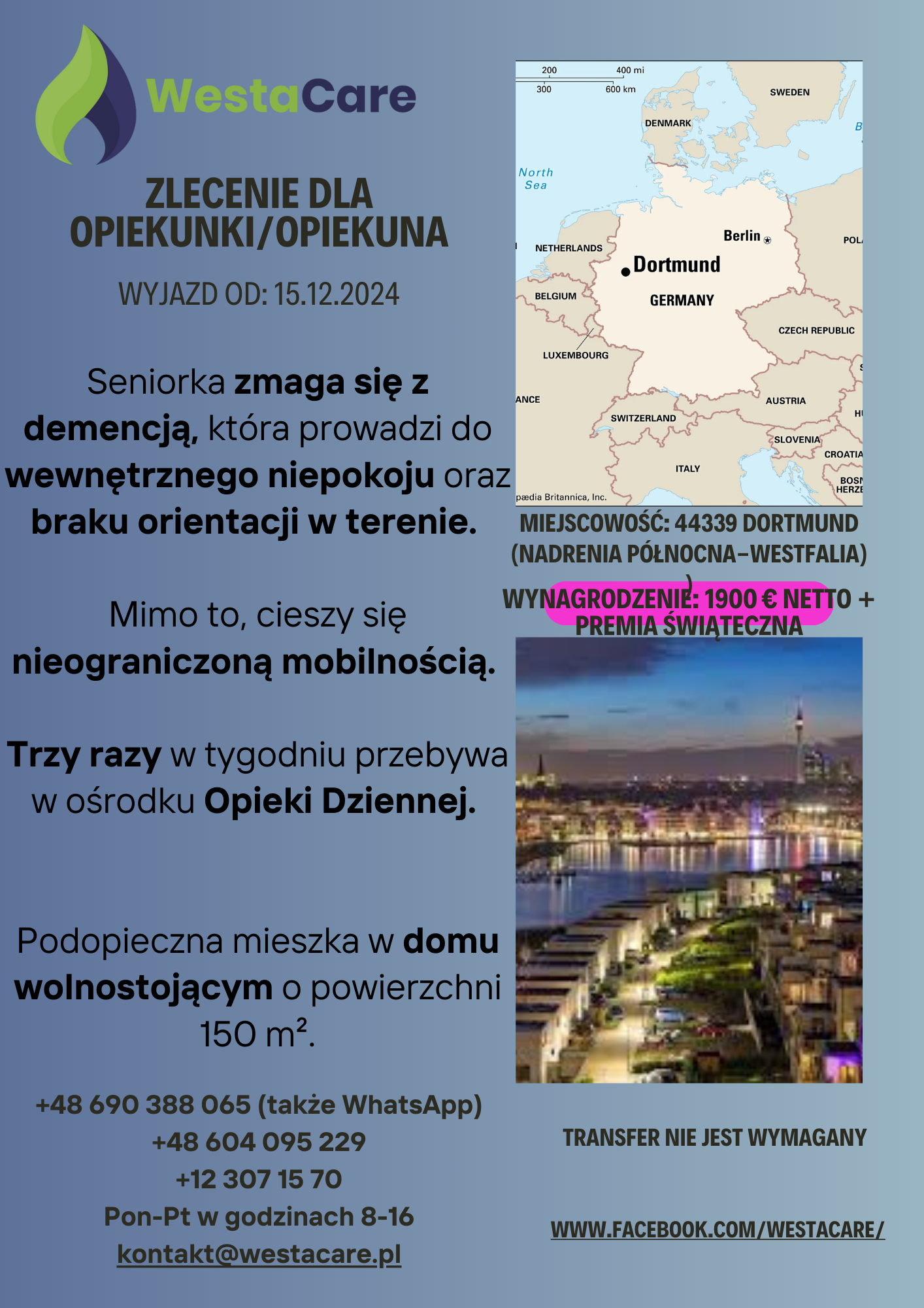 Zlecenie dla Opiekunki/Opiekuna od 15.12 1900 € netto + Premia Świąteczna