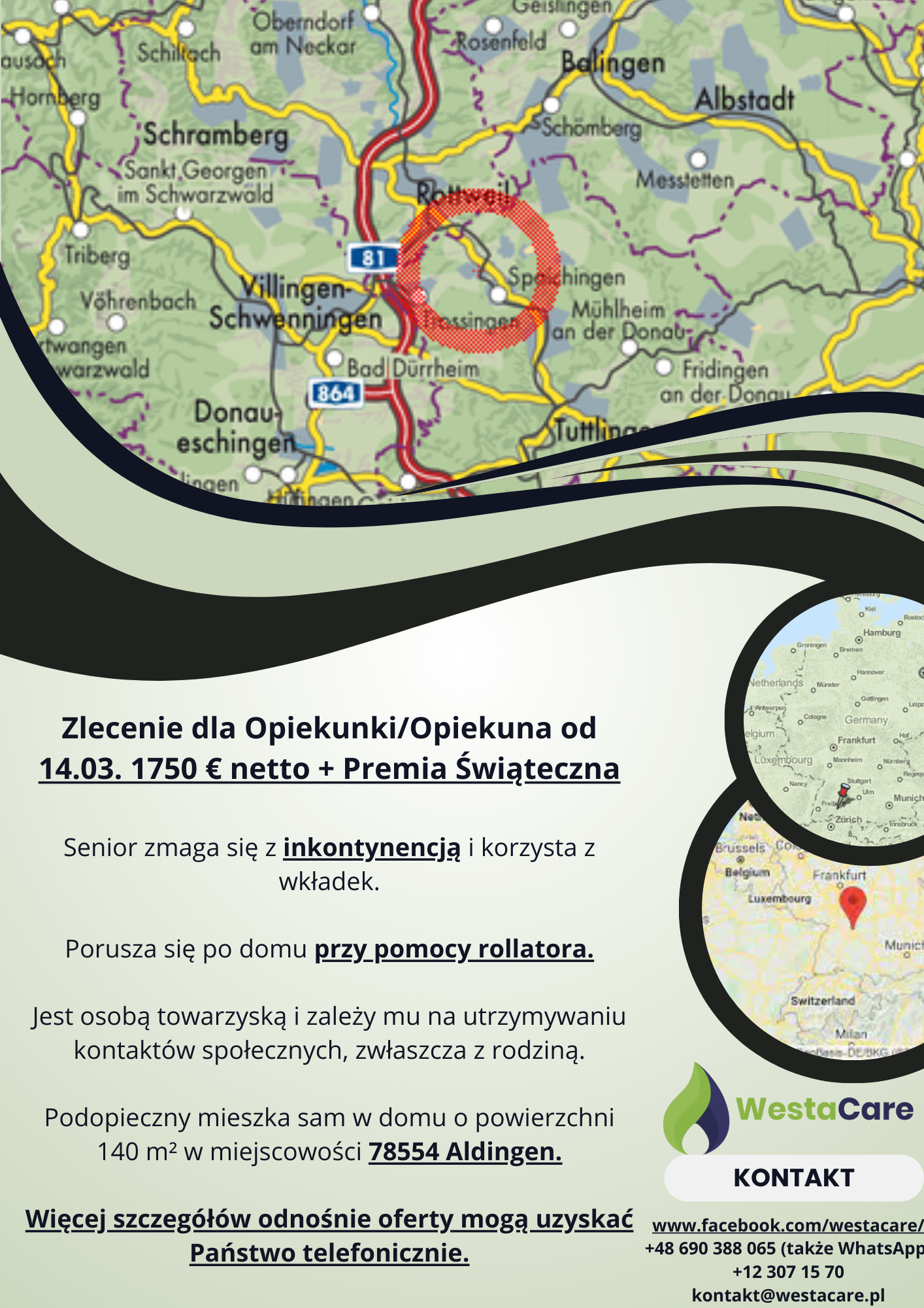 Zlecenie dla Opiekunki/Opiekuna od 14.03. 1750 € netto + Premia Świąteczna