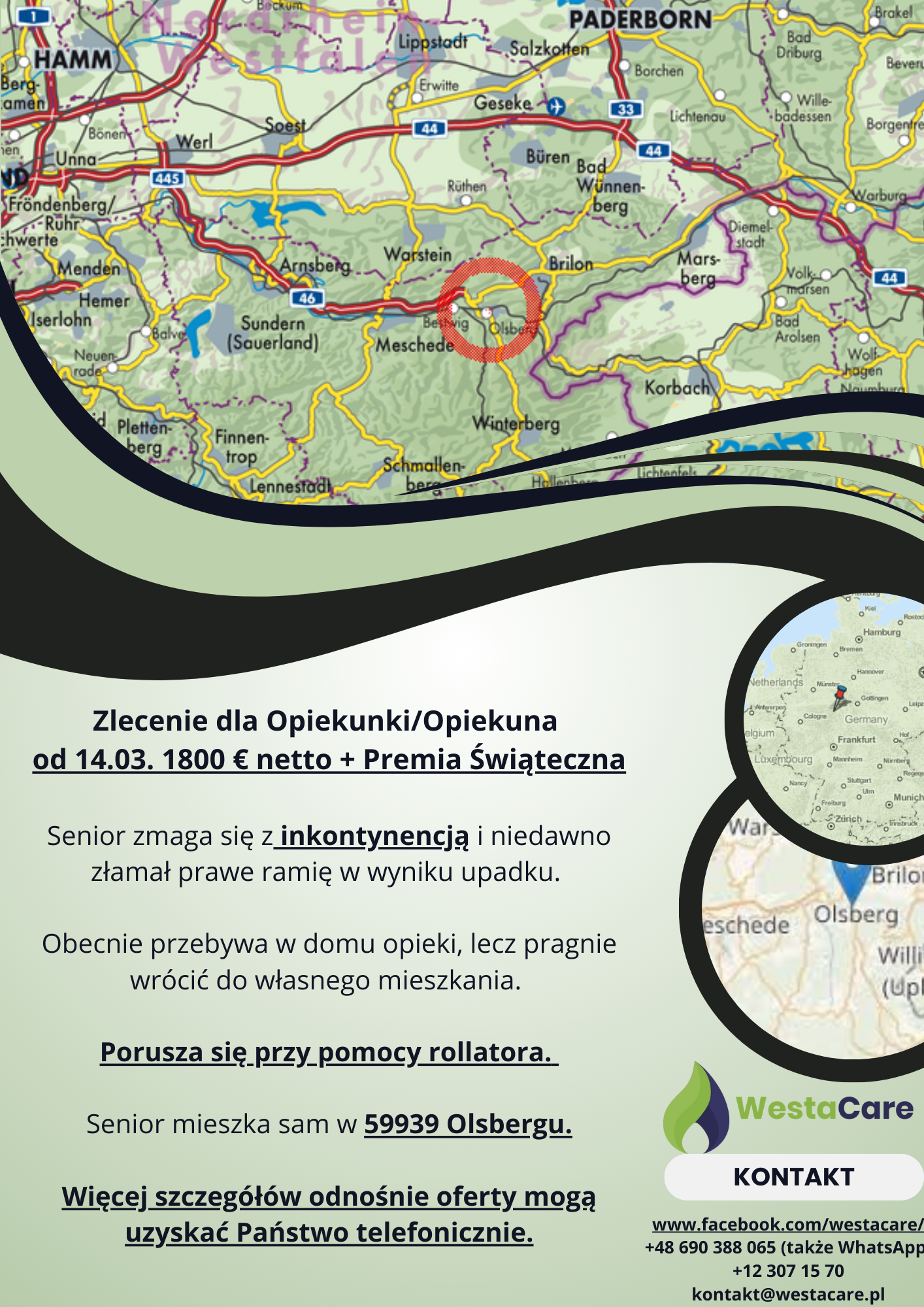 Zlecenie dla Opiekunki/Opiekuna od 14.03. 1800 € netto + Premia Świąteczna