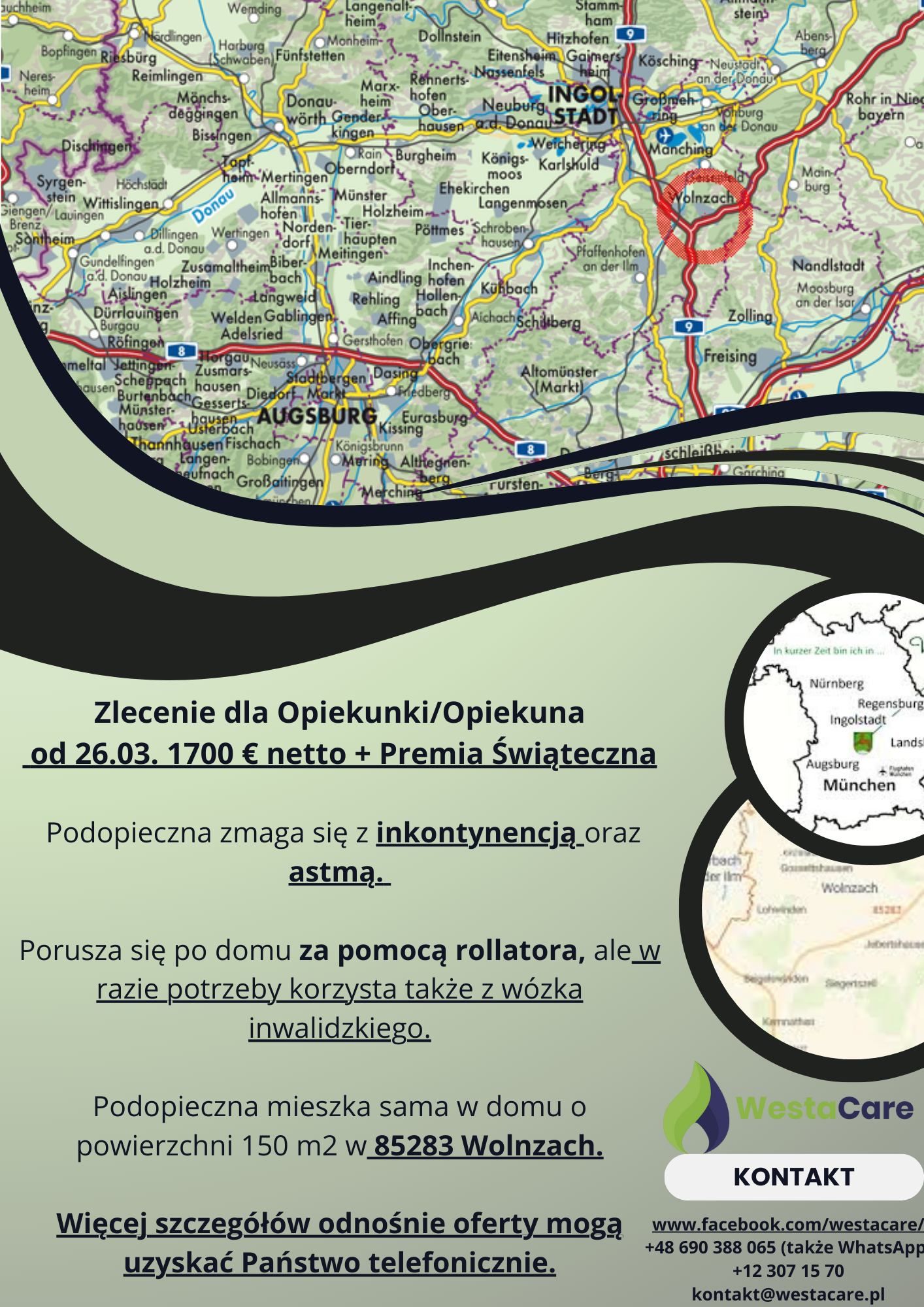 Zlecenie dla Opiekunki/Opiekuna od 26.03. 1700 € netto + Premia Świąteczna