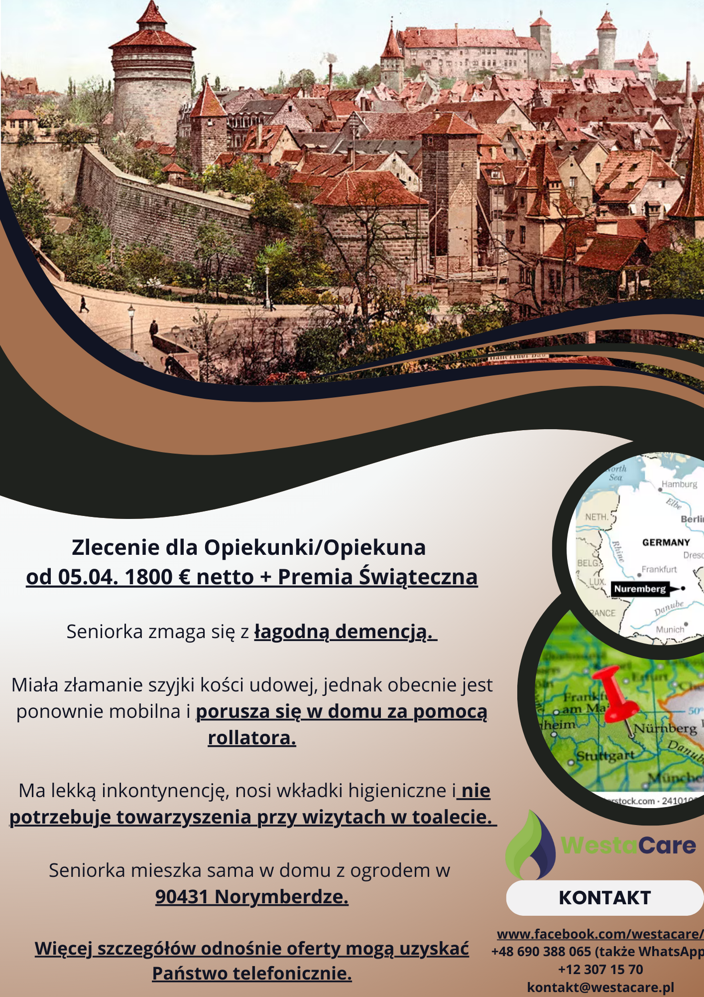 Zlecenie dla Opiekunki/Opiekuna od 05.04. 1800 € netto + Premia Świąteczna