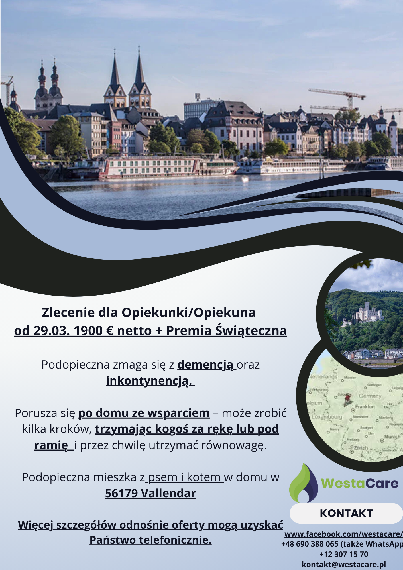 Zlecenie dla Opiekunki/Opiekuna od 29.03. 1900 € netto + Premia Świąteczna