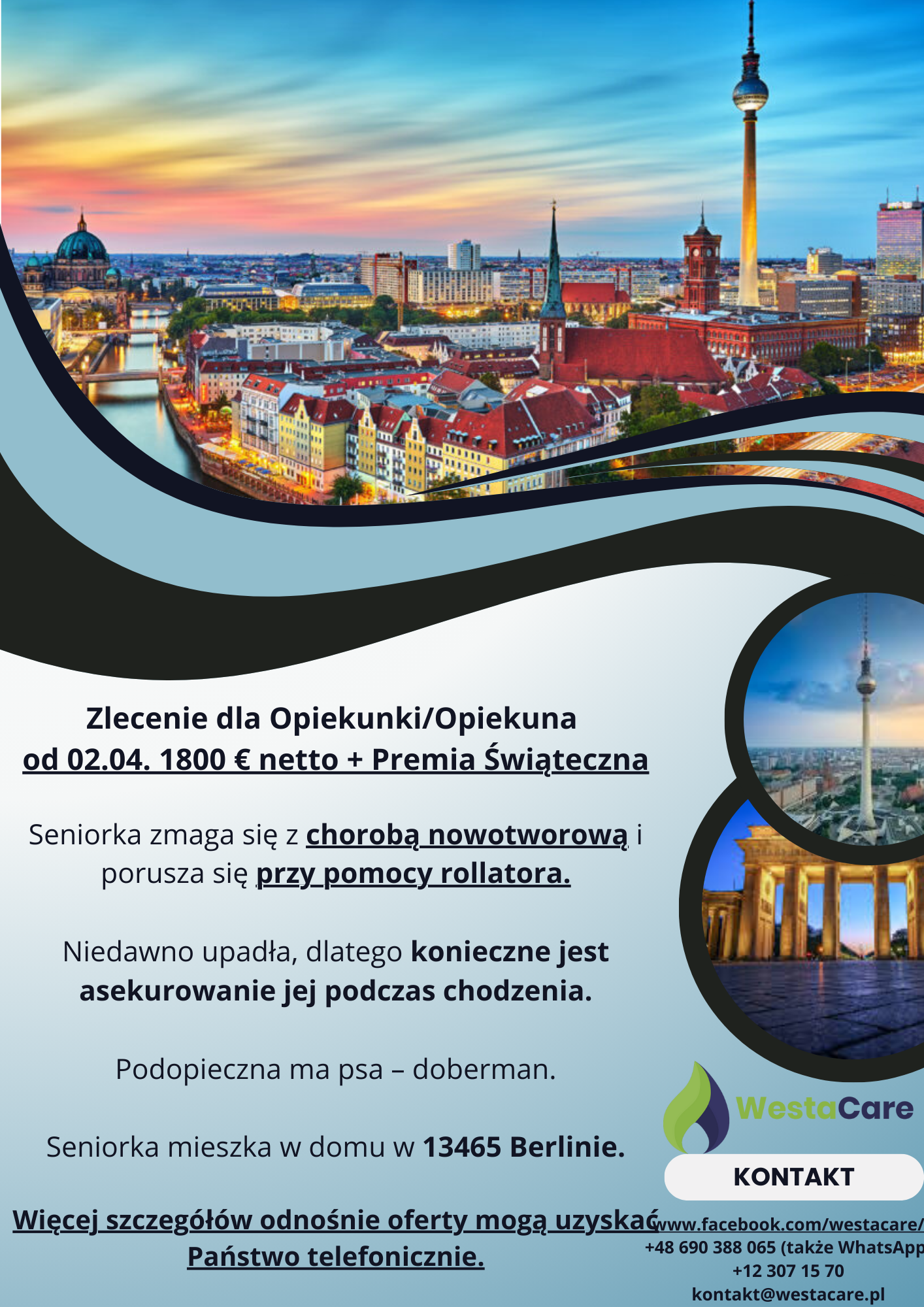 Zlecenie dla Opiekunki/Opiekuna od 02.04. 1800 € netto + Premia Świąteczna