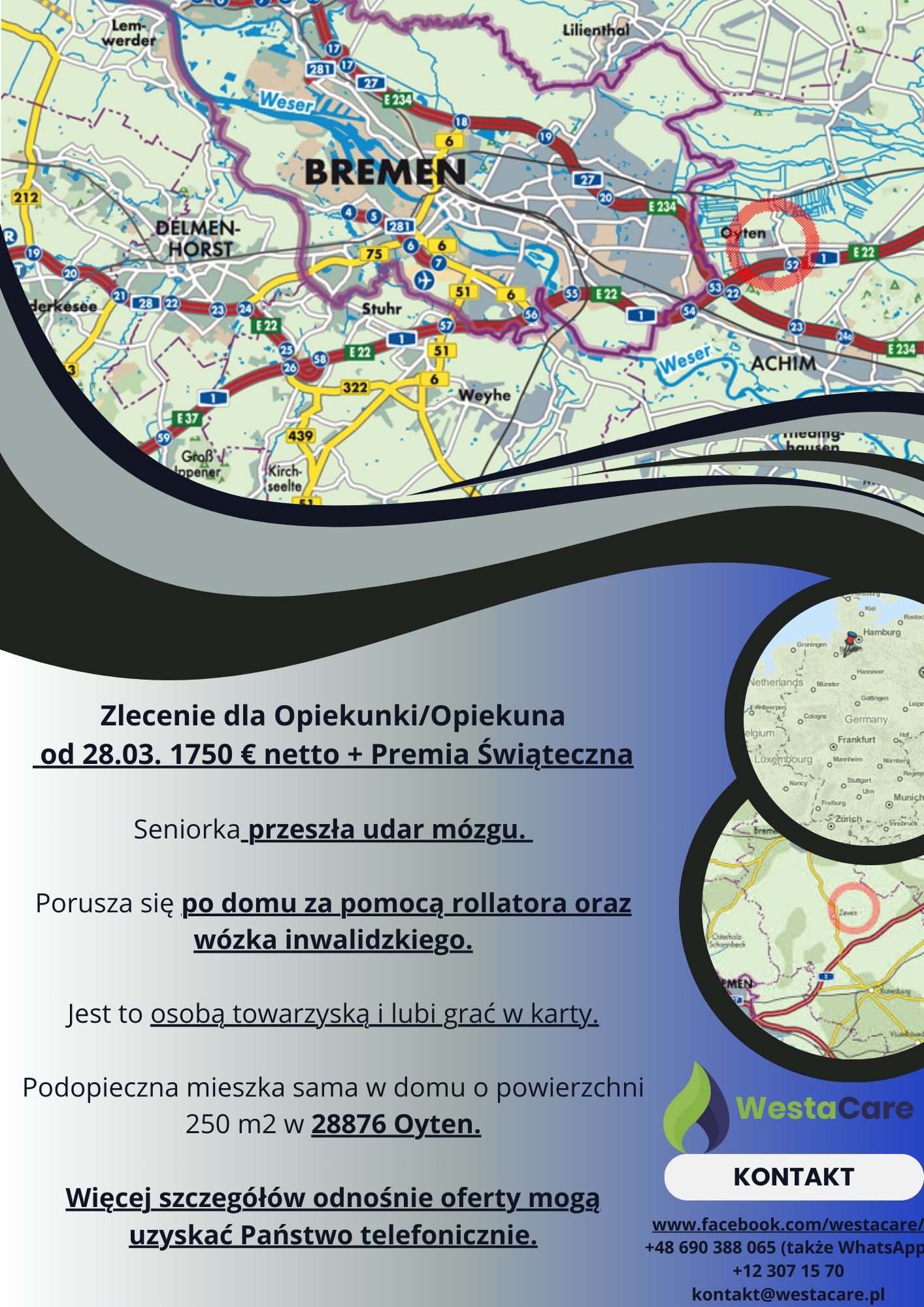Zlecenie dla Opiekunki/Opiekuna od 28.03. 1750 € netto + Premia Świąteczna