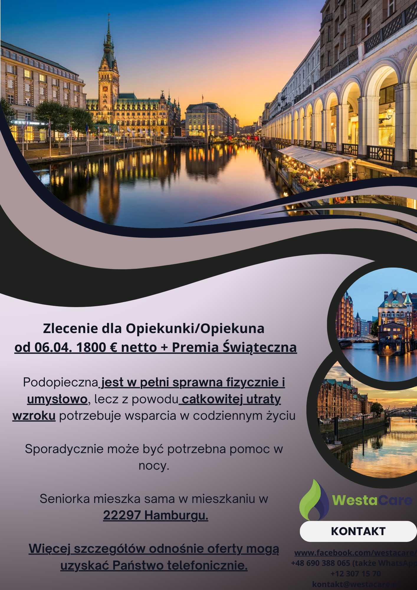 Zlecenie dla Opiekunki/Opiekuna od 06.04. 1800 € netto + Premia Świąteczna