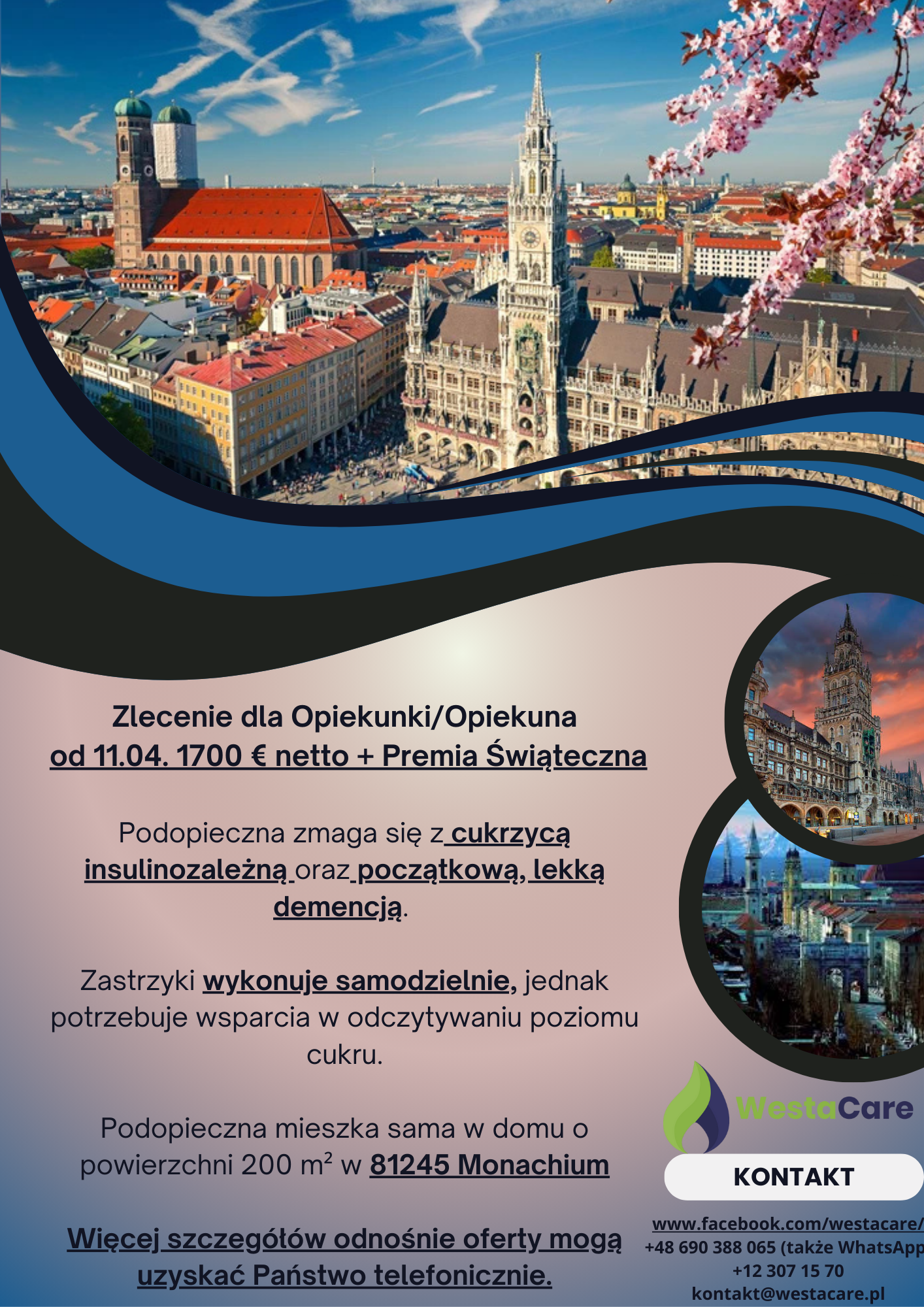 Zlecenie dla Opiekunki/Opiekuna od 11.04. 1700 € netto + Premia Świąteczna