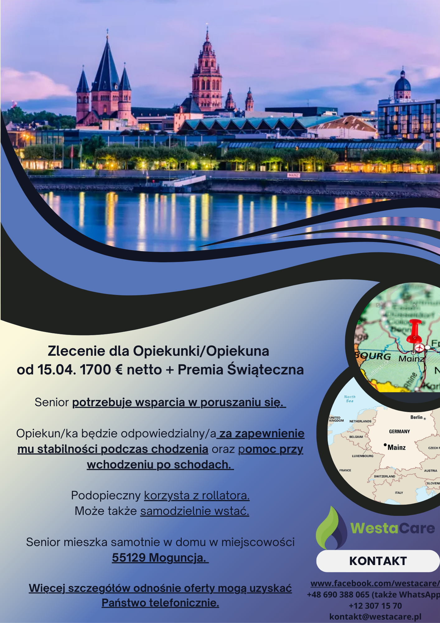 Zlecenie dla Opiekunki/Opiekuna od 15.04. 1700 € netto + Premia Świąteczna