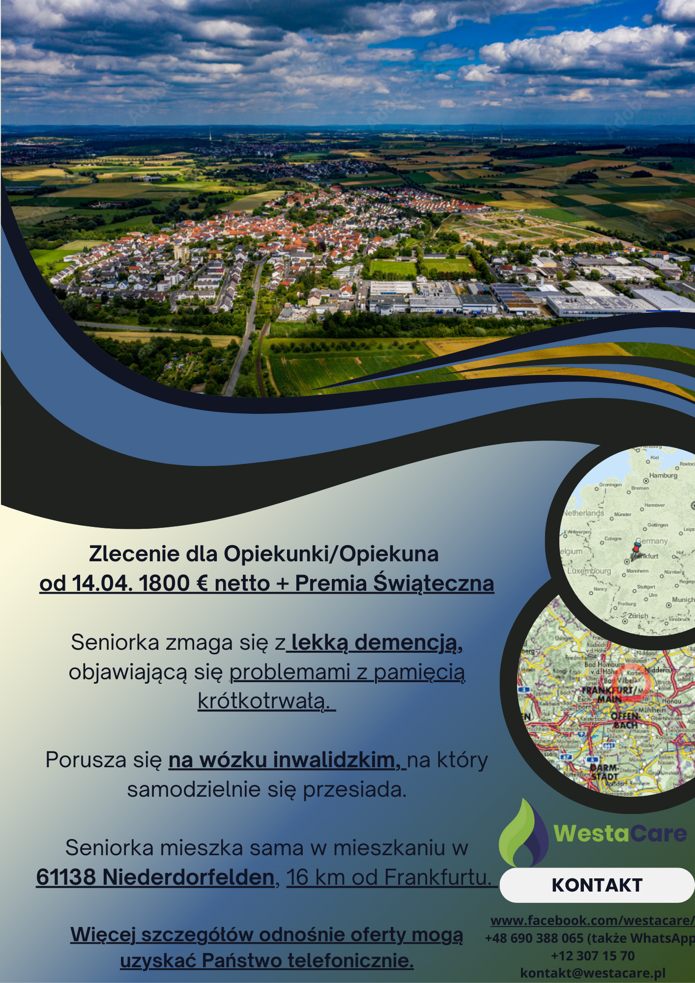 Zlecenie dla Opiekunki/Opiekuna od 14.04. 1800 € netto + Premia Świąteczna