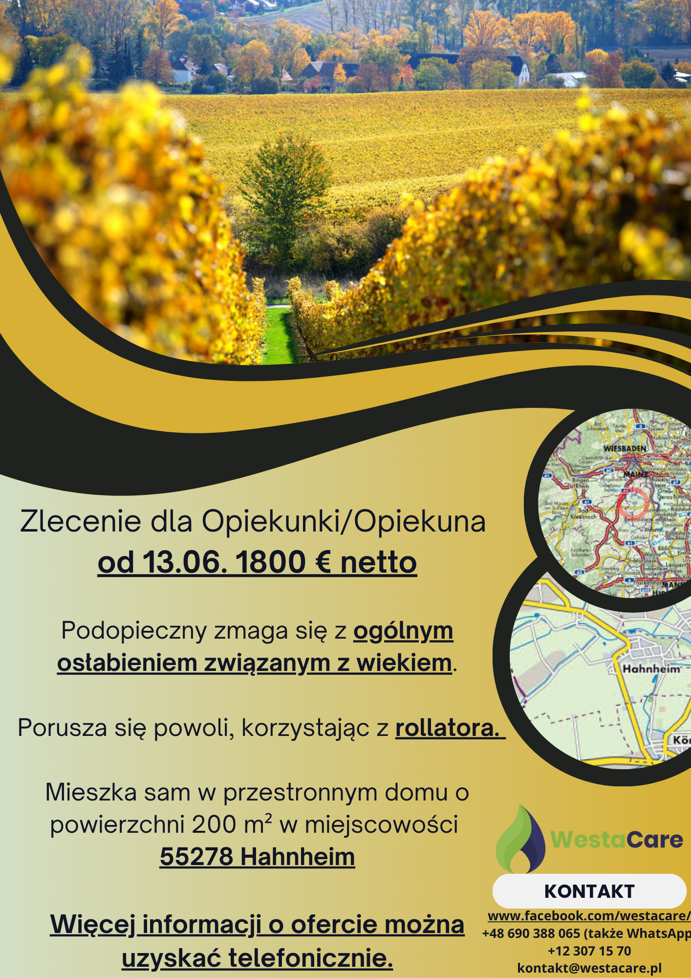 Zlecenie dla Opiekunki/Opiekuna od 13.06. 1800 € netto