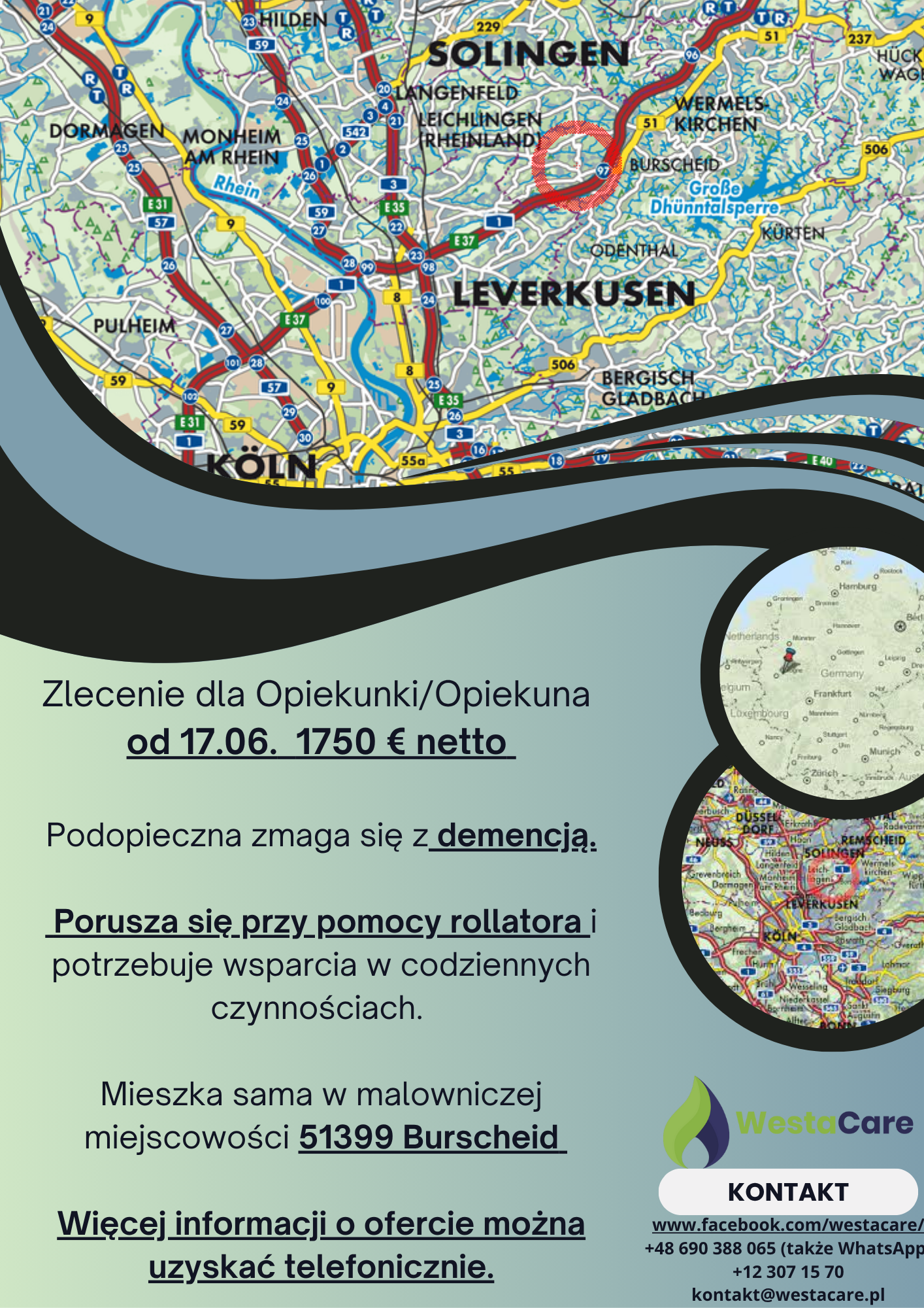 Zlecenie dla Opiekunki/Opiekuna od 17.06. 1750 € netto
