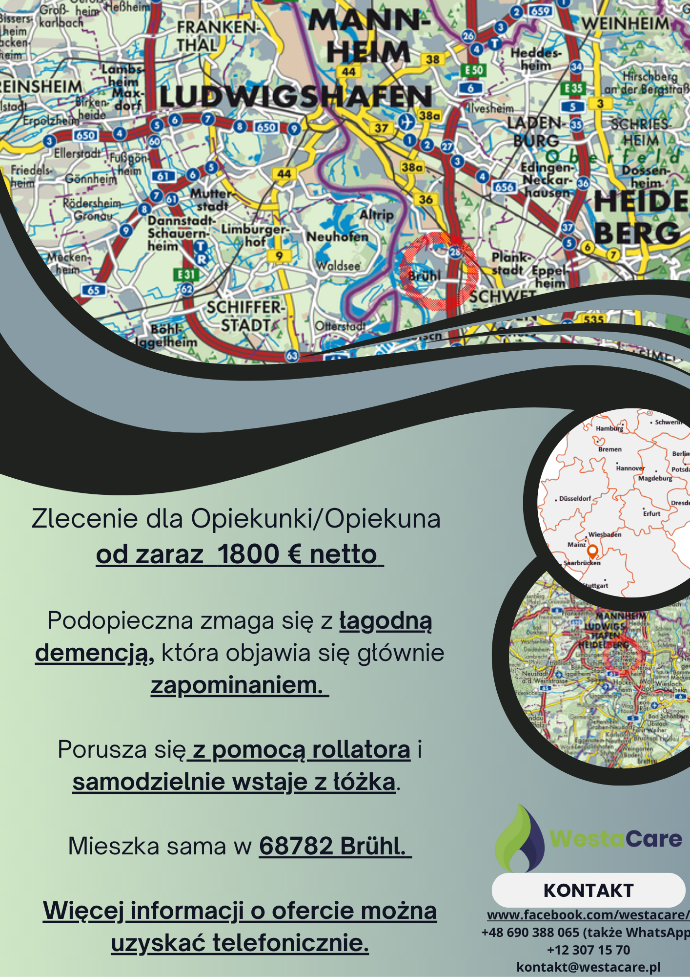 Zlecenie dla Opiekunki/Opiekuna od zaraz 1800 € netto