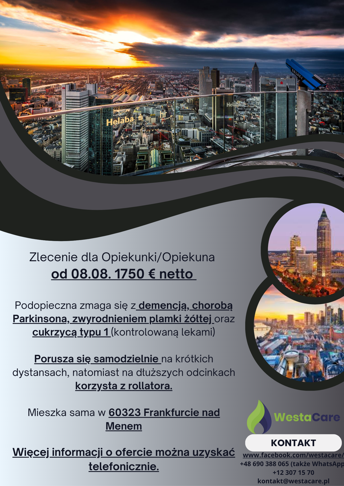 Zlecenie dla Opiekunki/Opiekuna od 08.08. 1750 € netto