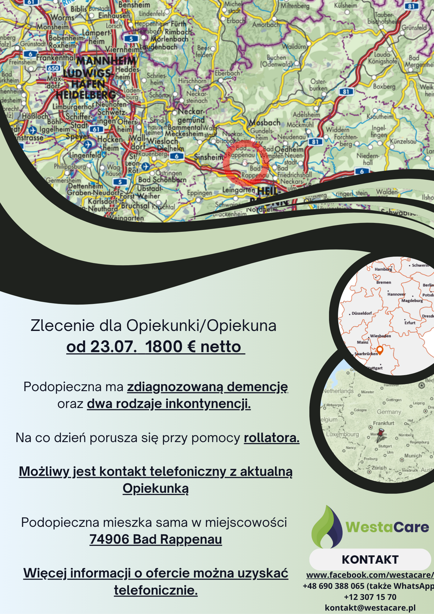 Zlecenie dla Opiekunki/Opiekuna od 23.07. 1800 € netto