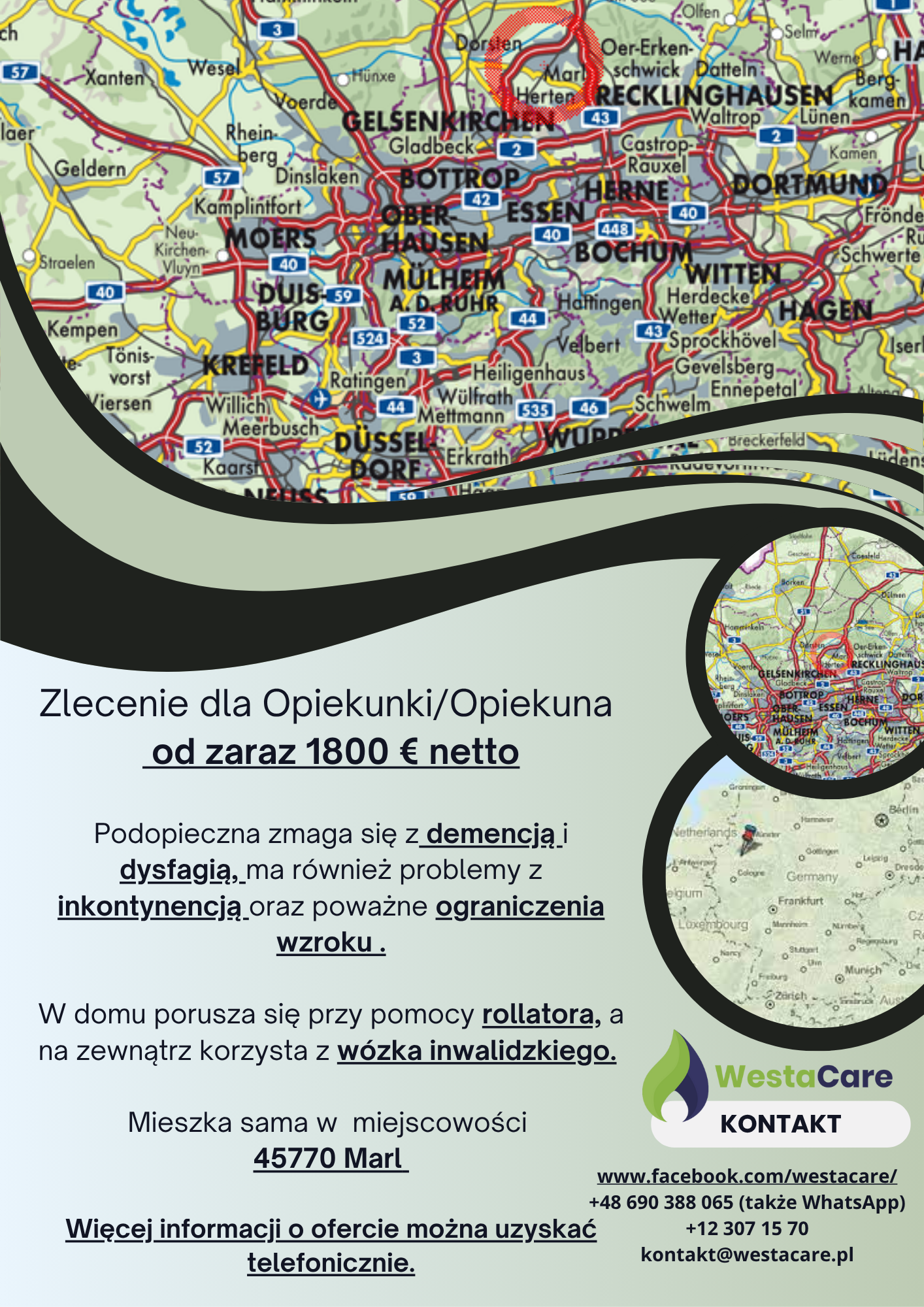 Podopieczna mieszka sama w przestronnym domu o powierzchni 150 m² w miejscowości 45770 Marl (Nadrenia Północna-Westfalia) – to spokojne, zielone miasto z dobrą infrastrukturą. W pobliżu znajdują się sklepy spożywcze, apteki, drogerie oraz centrum handlowe „Marler Stern”. Marl położone jest niedaleko takich miast jak Recklinghausen, Gelsenkirchen czy Herne.Dla Opiekuna lub Opiekunki przygotowano oddzielny, komfortowy pokój z pełnym wyposażeniem oraz dostępem do internetu.