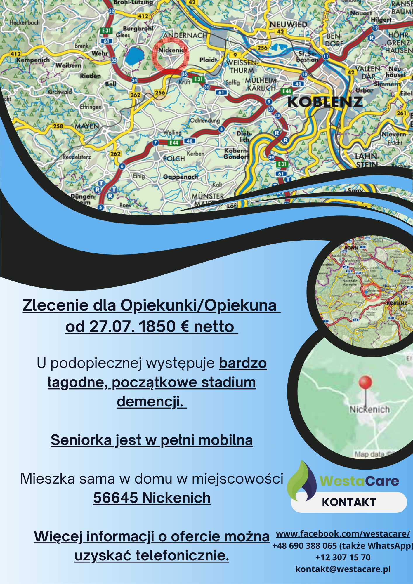 Mieszka sama w domu w miejscowości 56645 Nickenich, położonej w malowniczym regionie Nadrenii-Palatynatu. To spokojne, zadbane miasteczko oferuje mieszkańcom dobre zaplecze handlowe – w okolicy znajdują się sklepy spożywcze, apteki, piekarnie oraz inne niezbędne punkty usługowe. Nickenich słynie z bliskości do jeziora Laacher See i pięknych terenów spacerowych,. W pobliżu znajdują się także większe miasta, takie jak Andernach czy Koblenz. Do dyspozycji Opiekuna/Opiekunki jest komfortowy pokój gościnny z własną łazienką i dostępem do internetu.