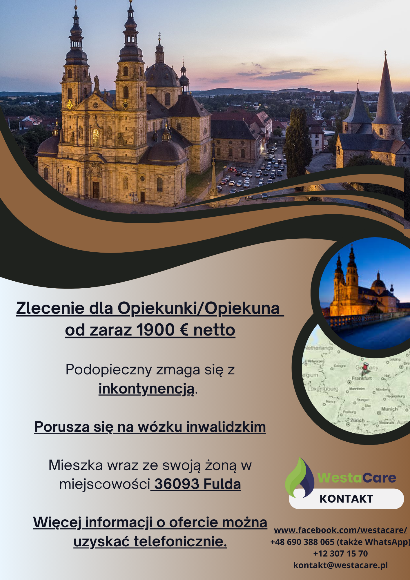 Zlecenie dla Opiekunki/Opiekuna od 29.07. 1800 € netto