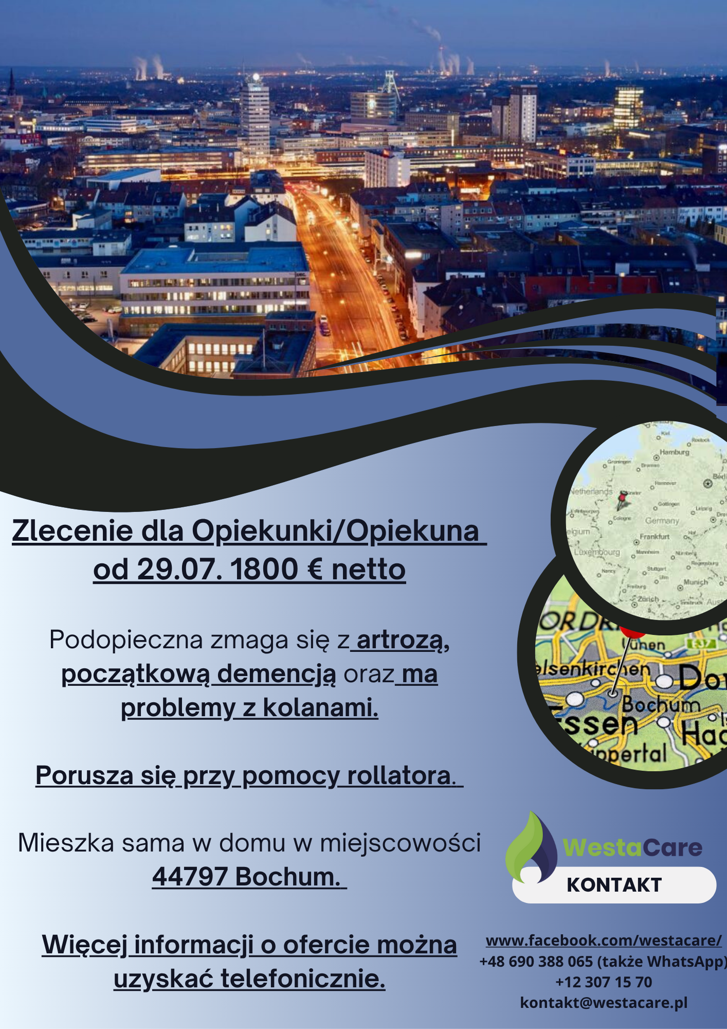 Zlecenie dla Opiekunki/Opiekuna od 29.07. 1800 € netto