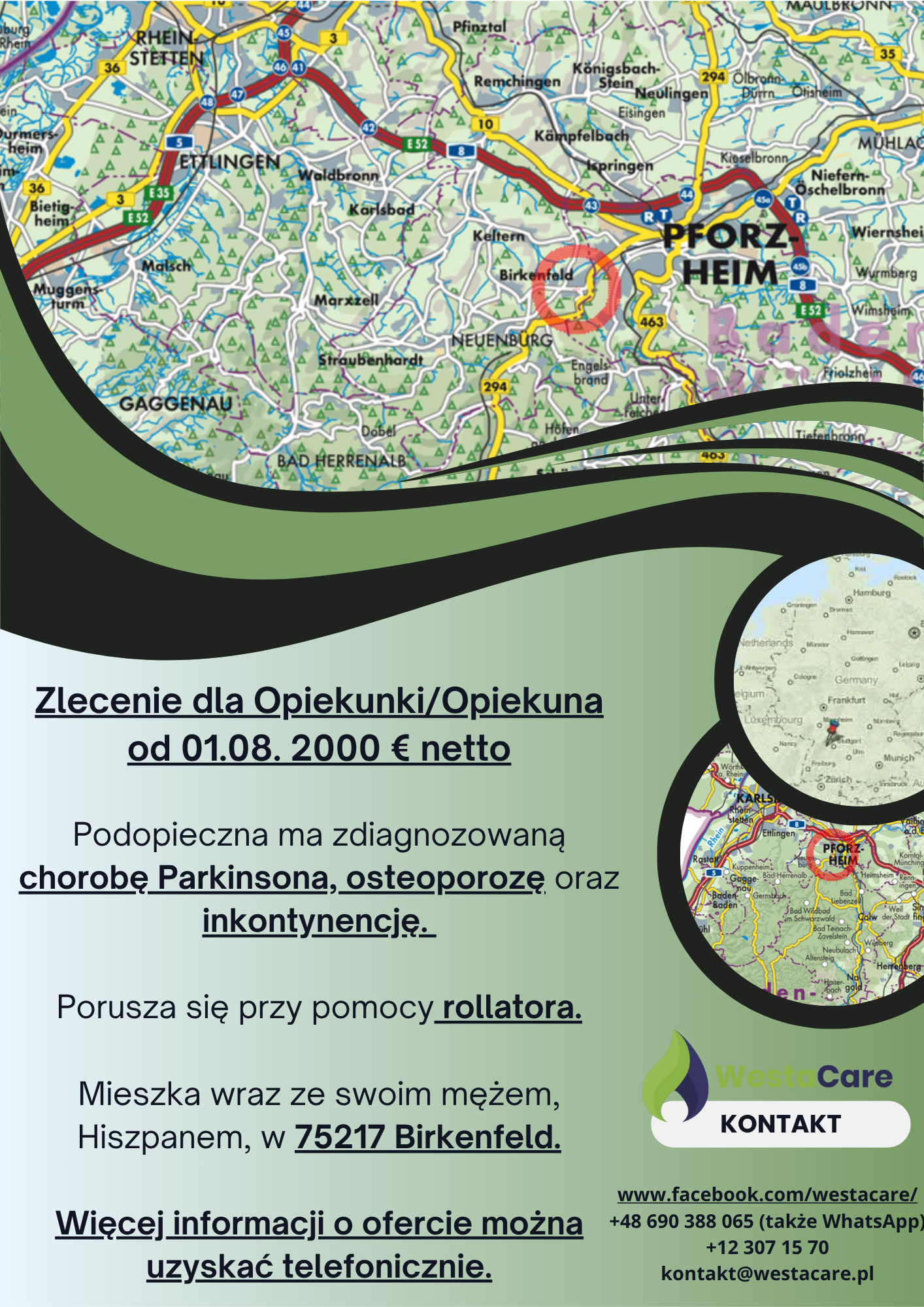 Pani mieszka wraz ze swoim mężem, który nie wymaga opieki fizycznej, lecz ze względu na lekką demencję potrzebuje przypominania o przyjmowaniu leków oraz regularnym piciu. Ich dom znajduje się w 75217 Birkenfeld – urokliwym mieście w południowo-zachodnich Niemczech, znanym z przyjaznej atmosfery i dobrego połączenia z większymi ośrodkami. W Birkenfeld dostępne są lokalne sklepy spożywcze i podstawowe punkty usługowe, a w pobliskich miastach, takich jak Pforzheim czy Stuttgart, znajduje się szeroki wybór sklepów, galerii handlowych oraz atrakcji kulturalnych. To spokojne miejsce, idealne dla osób ceniących komfort życia blisko natury, a jednocześnie z łatwym dostępem do większych centrów miejskich.
