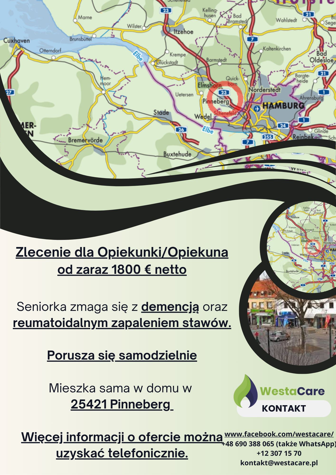 Podopieczna mieszka sama w domu w 25421 Pinneberg – to spokojne miasteczko położone niedaleko Hamburga. W okolicy znajdują się sklepy takie jak Edeka, Rewe, Lidl czy Rossmann. Miejsce jest dobrze skomunikowane i otoczone zielenią, co sprzyja codziennemu życiu i odpoczynkowi. Dla Opiekuna lub Opiekunki przygotowano w pełni umeblowany pokój z dostępem do internetu.