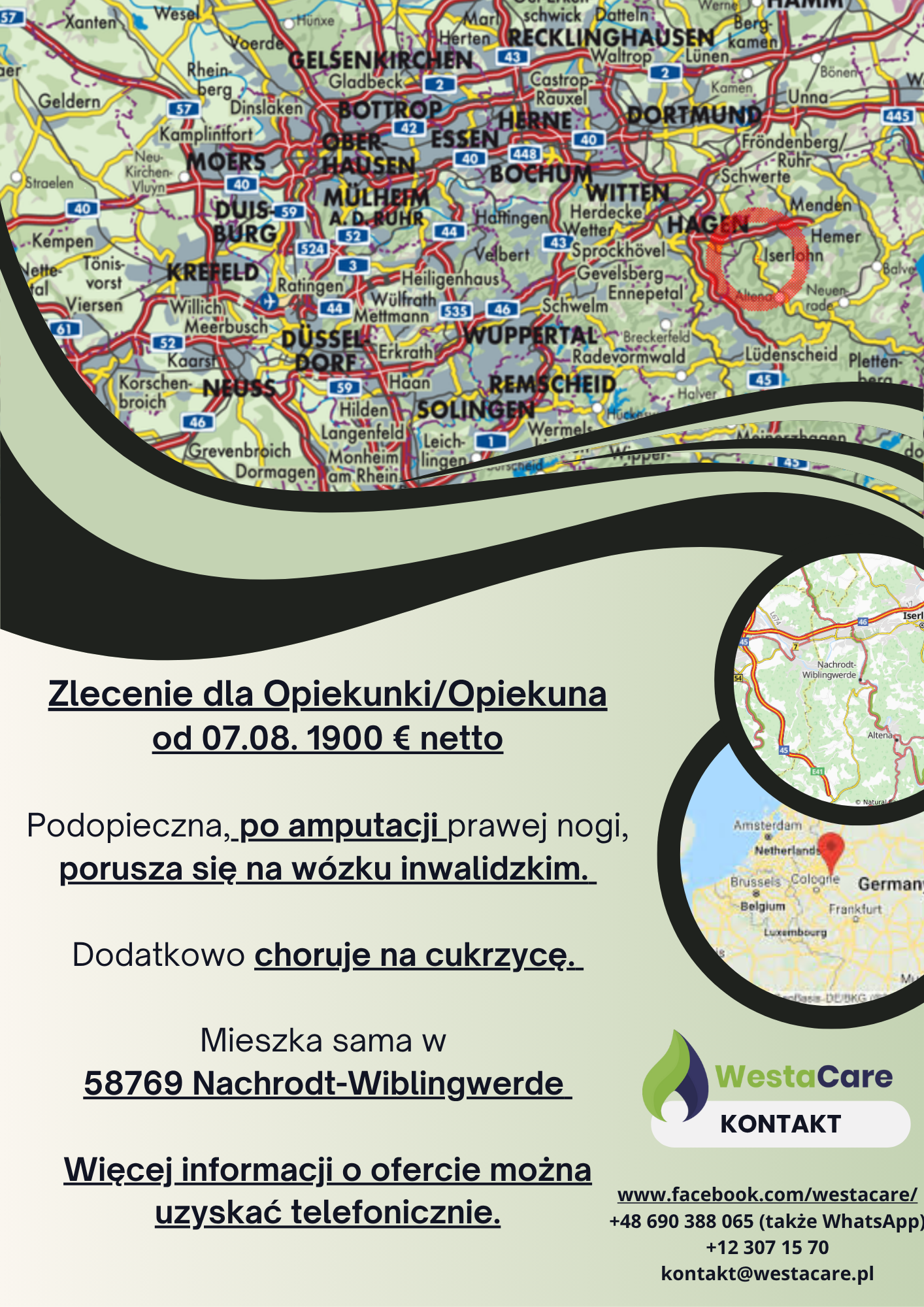 Pani mieszka sama w 58769 Nachrodt-Wiblingwerde – to spokojna, malownicza miejscowość w Nadrenii Północnej-Westfalii, otoczona zielenią i lasami, idealna dla osób ceniących ciszę i bliskość natury. W okolicy znajdują się sklepy spożywcze, piekarnie oraz apteka. W niedalekiej odległości leżą m.in. Altena, Iserlohn czy Lüdenscheid – większe miasta z pełną infrastrukturą i dodatkowymi udogodnieniami. Dla Opiekunki/na przygotowano w pełni umeblowany, komfortowy pokój z dostępem do internetu.