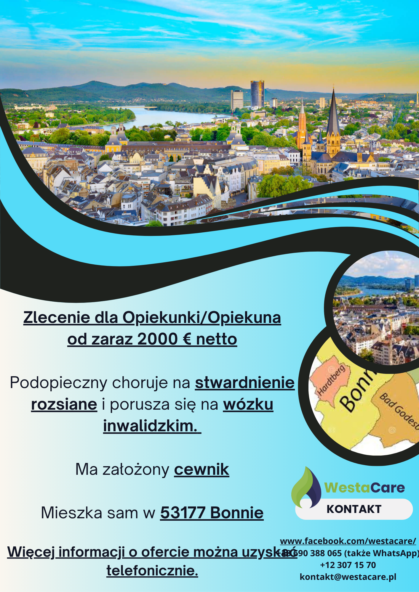 Pan mieszka sam w 53177 Bonnie– pięknym, historycznym mieście nad Renem, znanym z przyjaznej atmosfery i bogatej kultury. Bonn to miejsce, gdzie tradycja łączy się z nowoczesnością – w otoczeniu parków, muzeów i malowniczych nadbrzeży można cieszyć się spokojem i jednocześnie korzystać z dobrze rozwiniętej infrastruktury miejskiej. W okolicy dostępne są liczne sklepy, restauracje oraz centra usługowe, a także tereny zielone idealne na spacery i relaks. Na Opiekuna/kę czeka w pełni umeblowany pokój z dostępem do internetu.