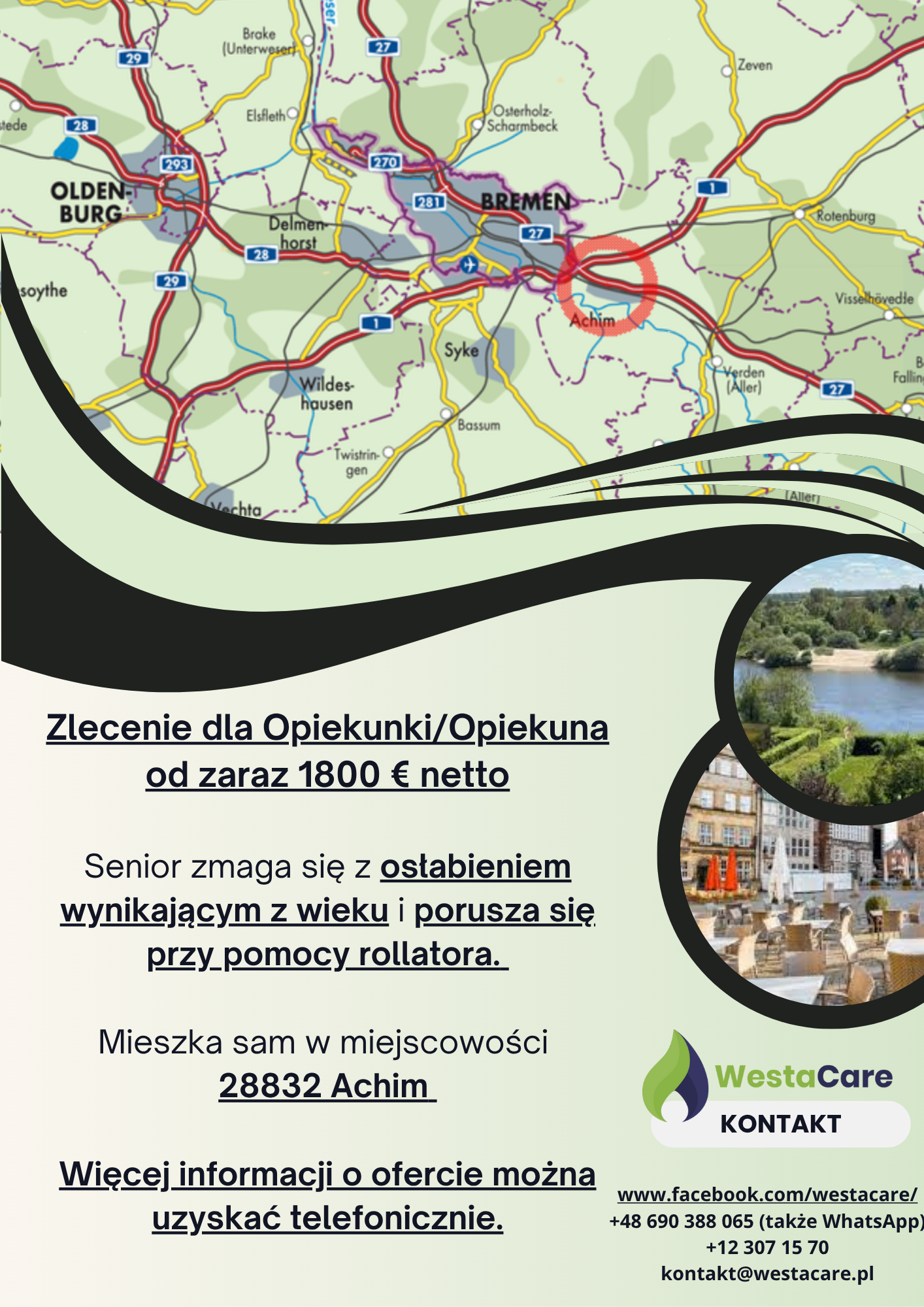Podopieczny mieszka sam w przestronnym domu o powierzchni 130 m² w miejscowości 28832 Achim – spokojnym i przyjaznym miasteczku w Dolnej Saksonii, położonym nad rzeką Wezerą. Achim słynie z urokliwego starego miasta, zielonych terenów rekreacyjnych oraz przyjaznej atmosfery. Miasto oferuje wygodne zaplecze handlowe: znajdują się tu liczne sklepy spożywcze (np. Edeka, Rewe, Aldi), apteki, piekarnie, drogerie oraz przytulne kawiarnie i restauracje. W pobliżu leżą większe miejscowości, takie jak Verden (Aller), Ottersberg czy Brema, z którą Achim ma bezpośrednie połączenie kolejowe i drogowe. W bezpośrednim sąsiedztwie mieszkają bliscy Pana – synowa jest wykwalifikowaną asystentką medyczną i w razie potrzeby służy pomocą oraz wsparciem w opiece. Dla Opiekuna/ki przygotowano osobne, komfortowe zakwaterowanie – dwa umeblowane pokoje o łącznej powierzchni 30 m², z dostępem do internetu.
