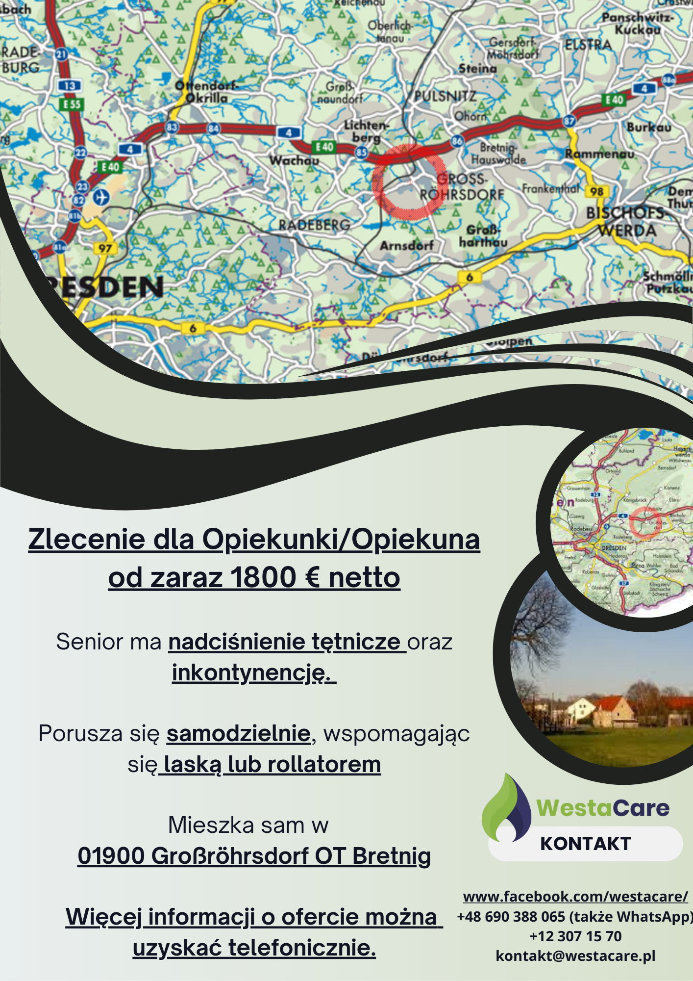Podopieczny mieszka sam w 01900 Großröhrsdorf OT Bretnig, spokojnej i malowniczej miejscowości w Saksonii, z lokalnymi sklepami, piekarniami i kawiarniami w pobliżu. Większe miasta, takie jak Bischofswerda, Kamenz i Bautzen, oferują dodatkowe możliwości zakupów i rozrywki. Dla Opiekuna/ki przygotowano komfortowy, w pełni wyposażony pokój z dostępem do internetu.