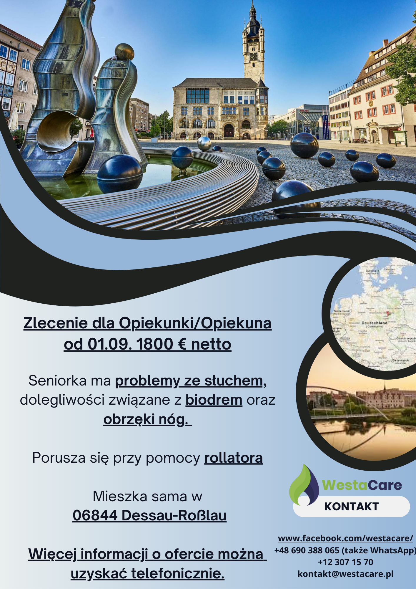 Podopieczna mieszka sama w 3-pokojowym mieszkaniu w centrum 06844 Dessau-Roßlau, uroczego i spokojnego miasta w Saksonii-Anhalt, nad rzeką Mulde. W centrum znajdują się liczne sklepy, kawiarenki i restauracje, a także parki i tereny rekreacyjne. Dessau-Roßlau leży w dogodnej odległości od miast takich jak Magdeburg, Halle i Lipsk, co ułatwia krótkie wycieczki i dostęp do większych centrów handlowych. Opiekuna/ki przygotowano komfortowy, w pełni wyposażony pokój gościnny z dostępem do internetu.