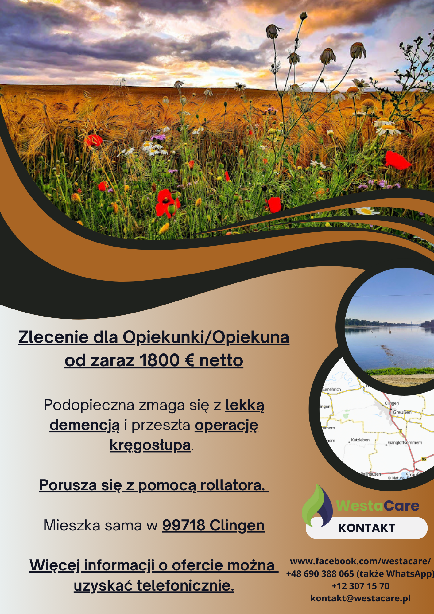 Zlecenie dla Opiekunki/Opiekuna od zaraz 1800 € netto