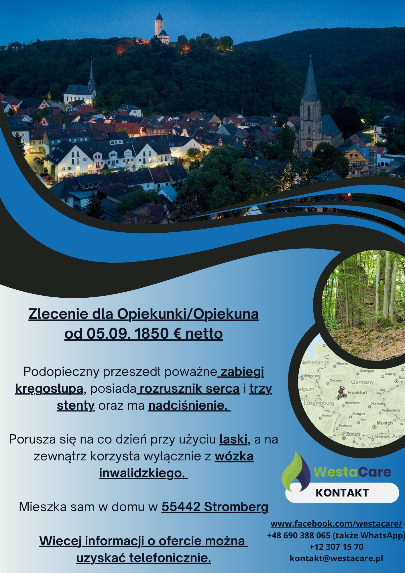 Senior mieszka sam w domu w 55442 Stromberg, spokojnej miejscowości w Nadrenii-Palatynacie, otoczonej zielenią i malowniczymi krajobrazami. W miejscowości znajdują się sklepy spożywcze, m.in. REWE i Edeka, a w pobliskich miastach, takich jak Bingen czy Bad Kreuznach, dostępne są apteki i punkty usługowe. Dla Opiekuna/ki przygotowano komfortowy pokój gościnny z dostępem do internetu.