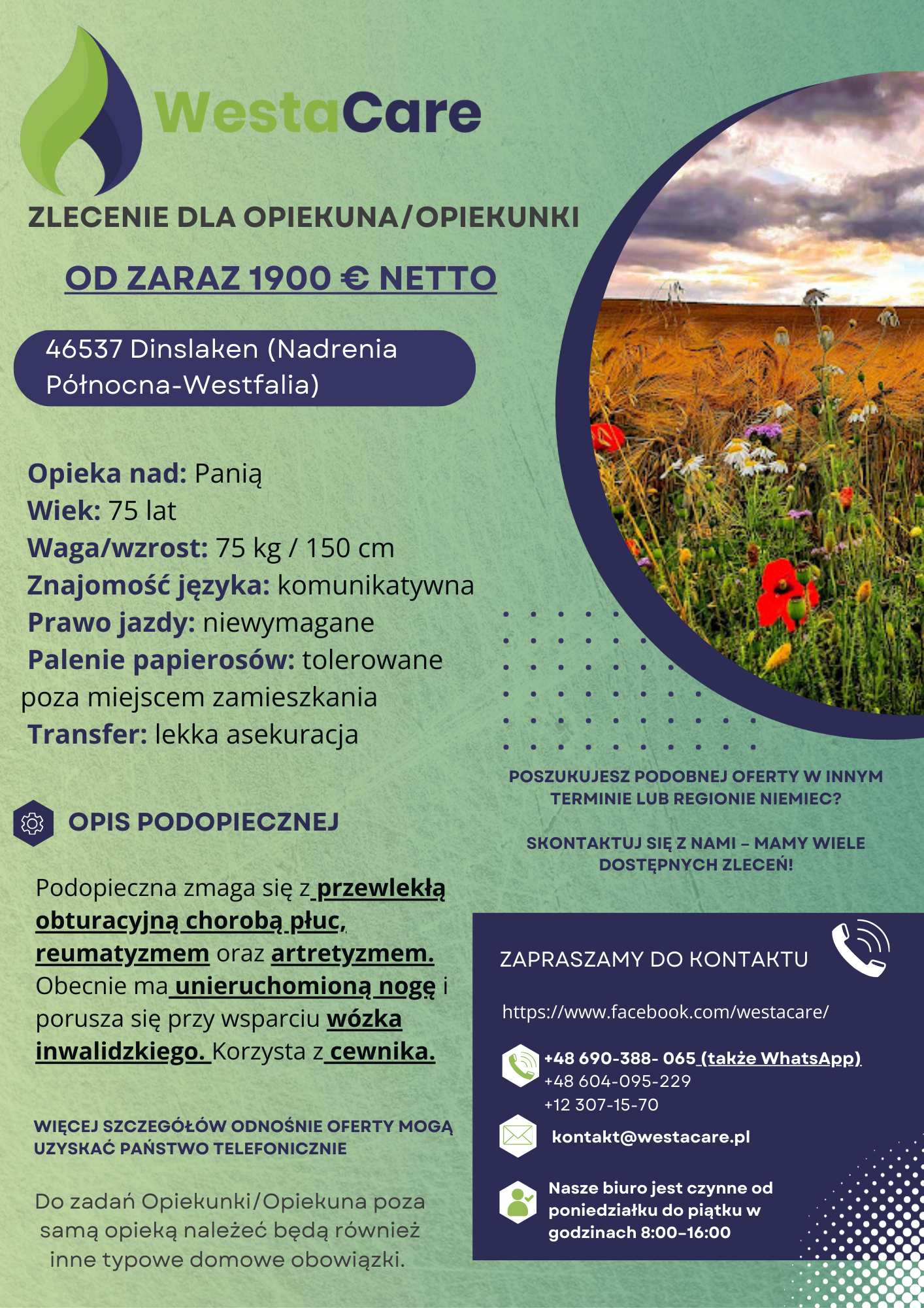 Zlecenie dla Opiekunki/Opiekuna od zaraz 1900 € netto