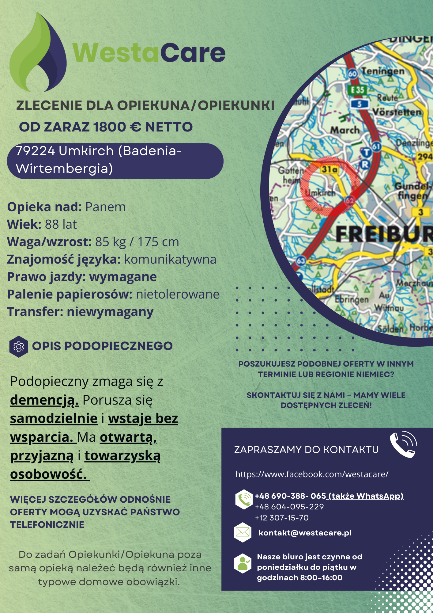 Dom podopiecznego ma 100 m² i znajduje się w malowniczym 79224 Umkirch, spokojnej miejscowości otoczonej zielenią, z przyjazną atmosferą i dobrym dostępem do sklepów spożywczych, piekarni i apteki. W pobliżu znajdują się większe miejscowości, takie jak Freiburg i Denzlingen. Opiekun/opiekunka ma do dyspozycji komfortowy, w pełni umeblowany pokój z dostępem do internetu.