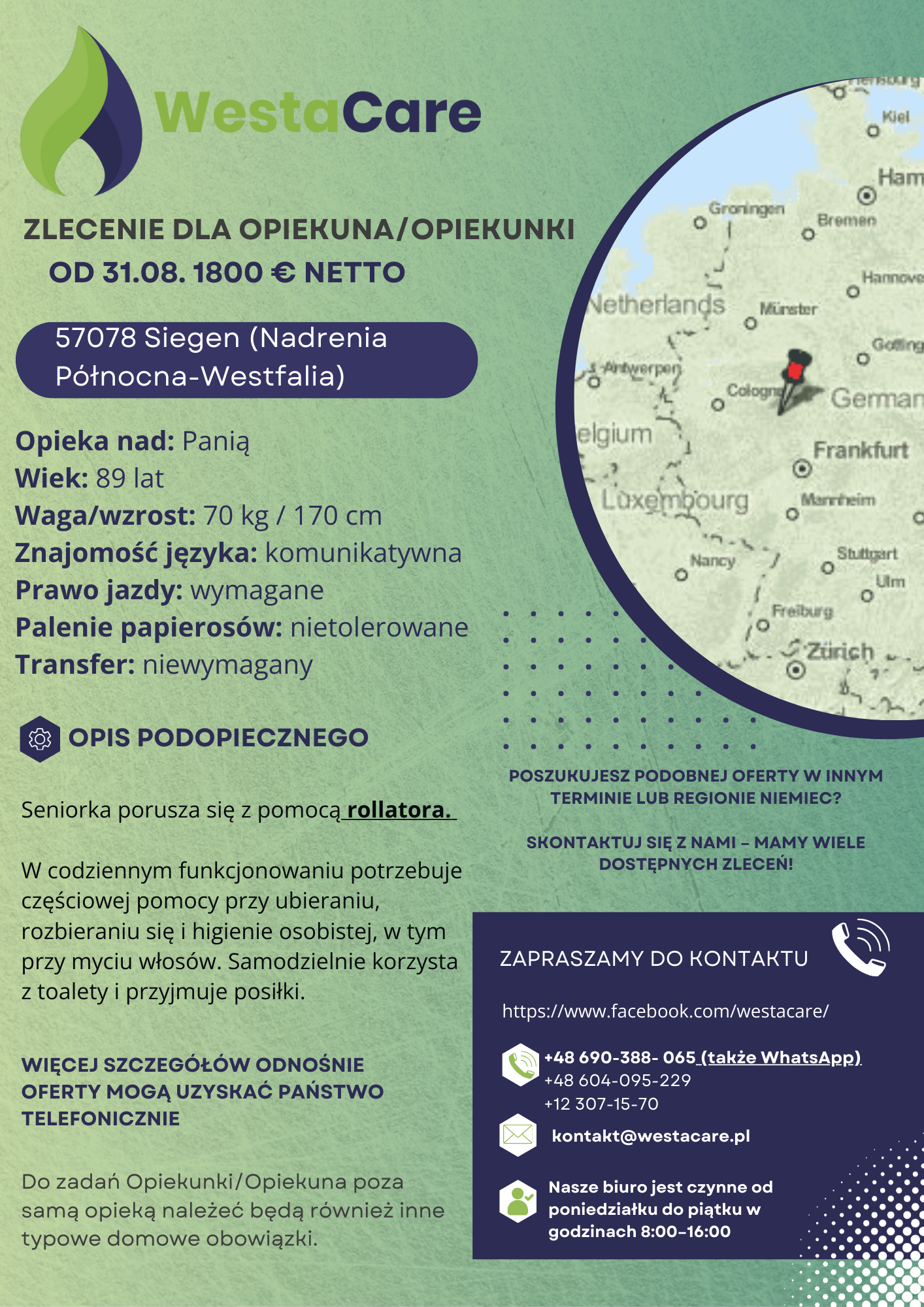 Zlecenie dla Opiekunki/Opiekuna od 31.08. 1800 € netto