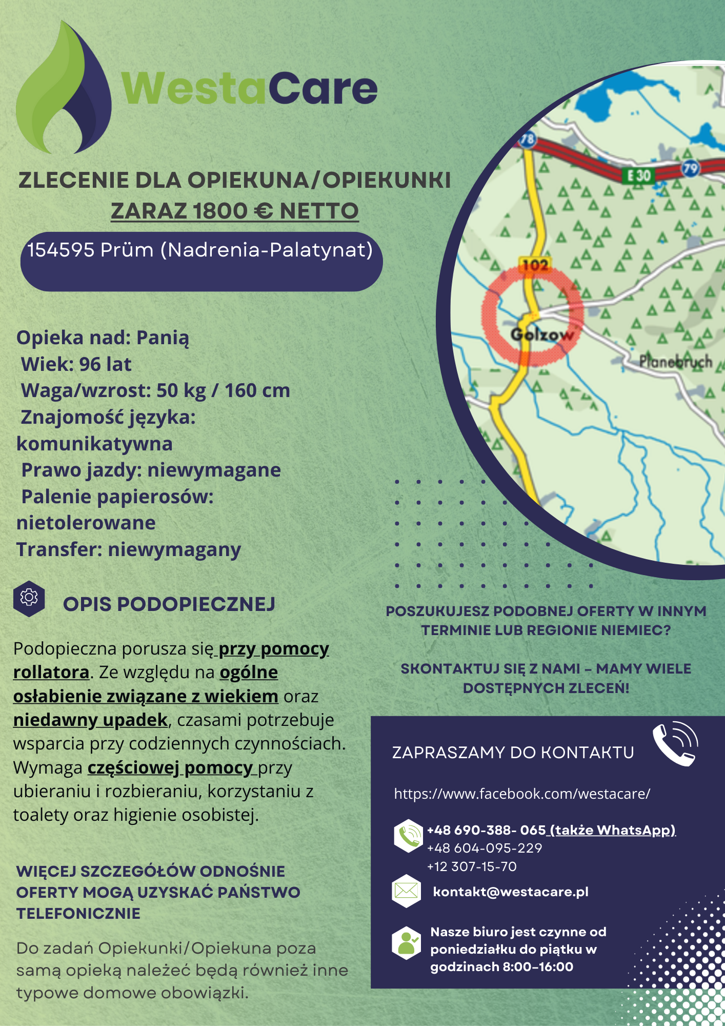 Zlecenie dla Opiekunki/Opiekuna od zaraz 1800 € netto
