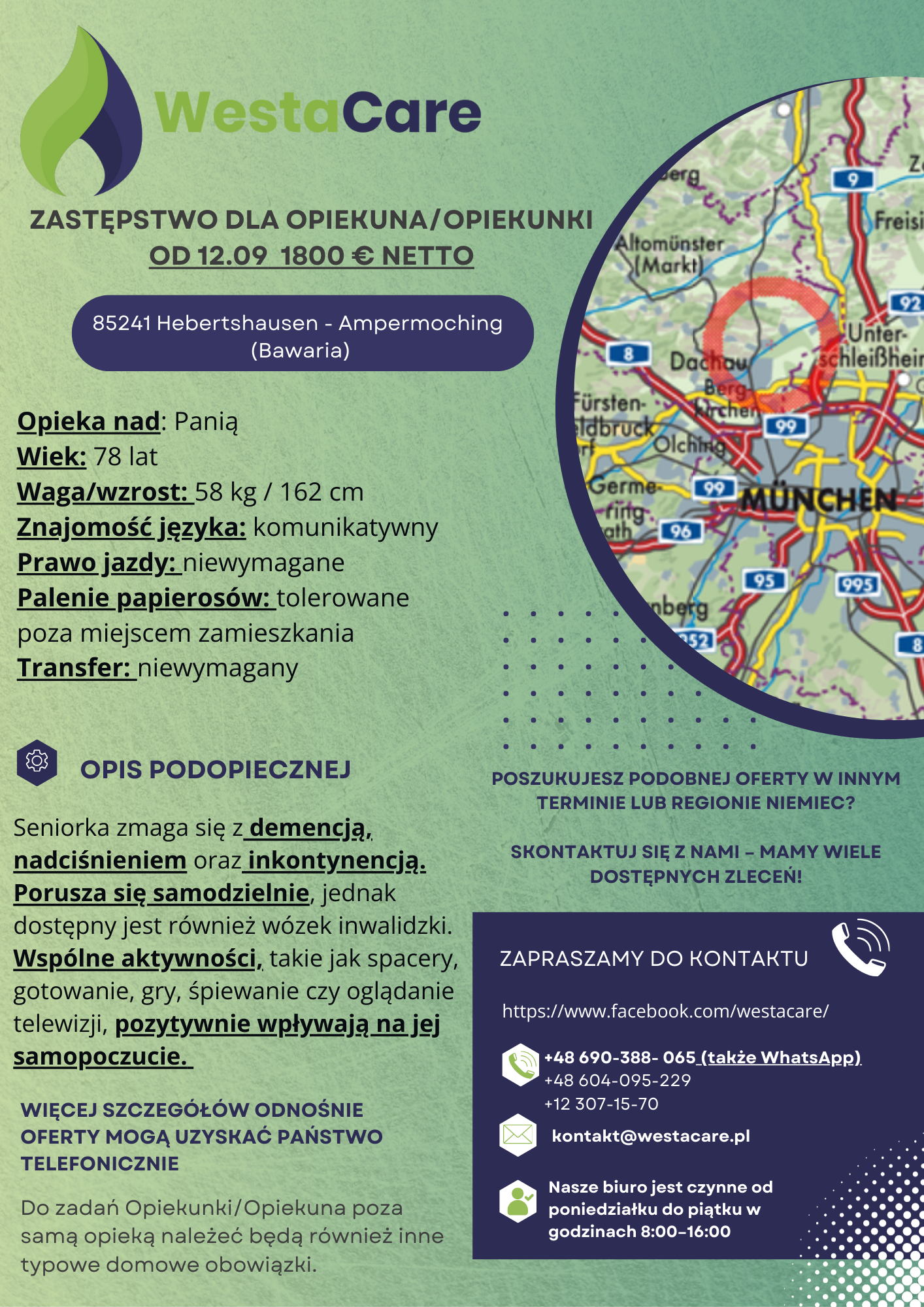 Podopieczna mieszka sama w domu o powierzchni 150 m² w 85241 Hebertshausen, w dzielnicy Ampermoching – spokojnej i przyjaznej okolicy, otoczonej zielenią, idealnej dla osób ceniących ciszę i kontakt z naturą. W miejscowości znajdują się sklepy spożywcze, lokale usługowe oraz kawiarnie, a większe miasta, takie jak Dachau i Monachium, są w niewielkiej odległości, co zapewnia łatwy dostęp do dodatkowych sklepów i atrakcji. Do zadań Opiekunki/Opiekuna poza samą opieką należeć będą również inne typowe domowe obowiązki.