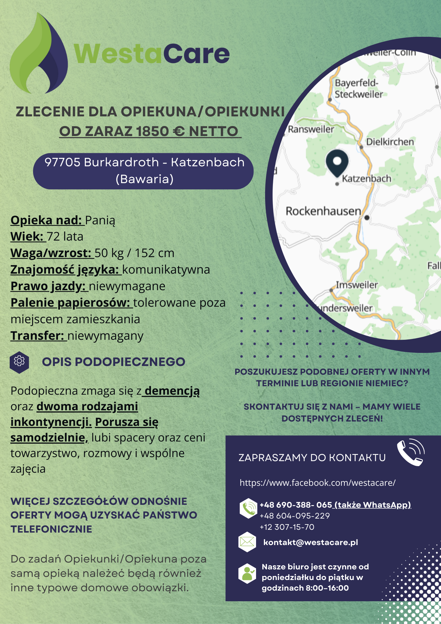 Zlecenie dla Opiekunki/Opiekuna od zaraz 1850 € netto