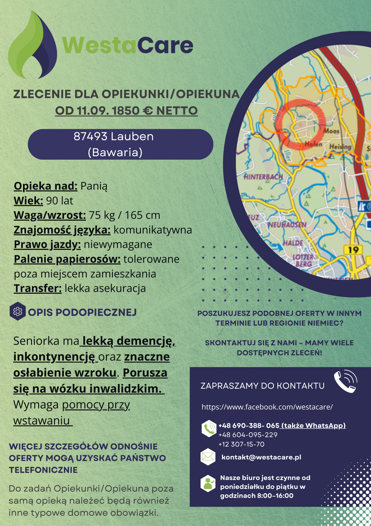 Zlecenie dla Opiekunki/Opiekuna od 11.09. 1850 € netto