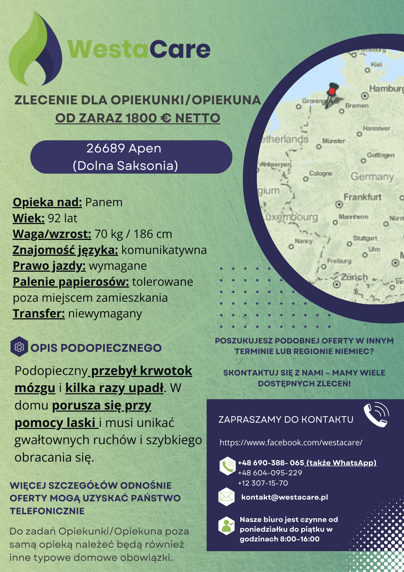 Senior mieszka sam w domu w miejscowości 26689 Apen w Dolnej Saksonii, w regionie Ammerland. Apen to urokliwe miasteczko o bogatej historii, sięgającej XIII wieku, znane z malowniczych ulic i spokojnej atmosfery. W okolicy znajdują się różnorodne sklepy i punkty usługowe, w tym supermarkety, drogerie, sklepy z odzieżą oraz lokalne restauracje i kawiarnie. Miejscowość ma bardzo dobrą lokalizację, w pobliżu znajdują się takie miejscowości jak Westerstede, Bad Zwischenahn, Edewecht czy Uplengen. Opiekuna/ki przygotowano komfortowy, w pełni wyposażony pokój gościnny z dostępem do internetu.