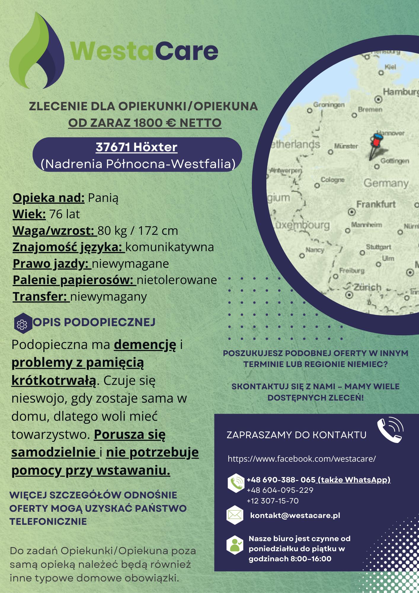 Zlecenie dla Opiekunki/Opiekuna od zaraz 1800 € netto