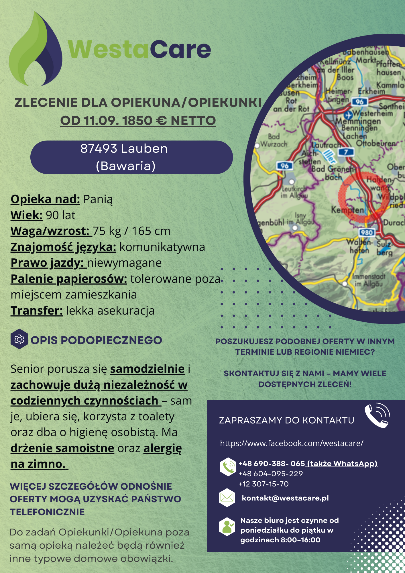 Zlecenie dla Opiekunki/Opiekuna od 11.09. 1850 € netto