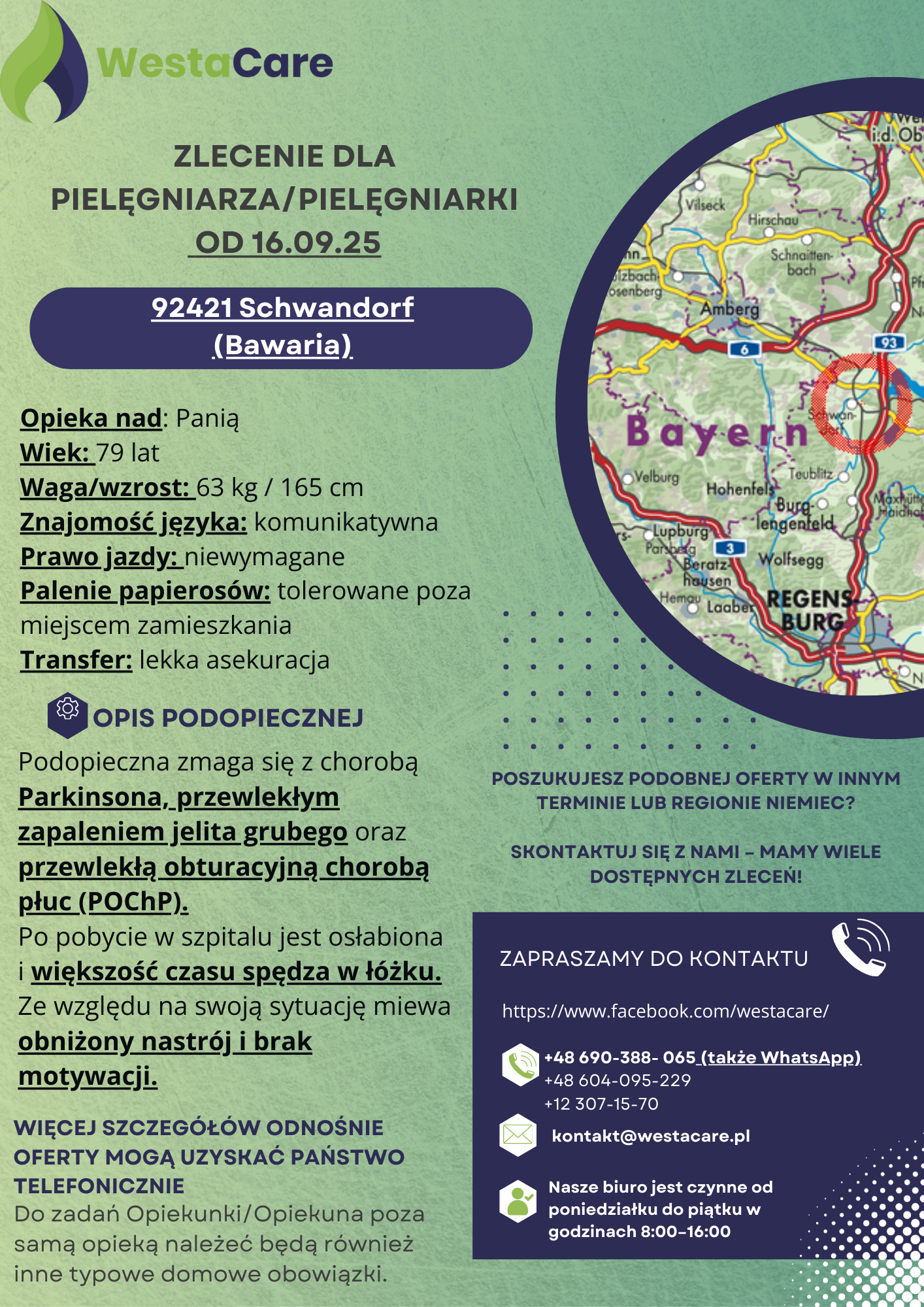Seniorka mieszka w uroczym bawarskim mieście 92421 Schwandorf, położonym nad rzeką Naab. To spokojne miejsce z przyjazną atmosferą i malowniczymi zakątkami – w centrum można znaleźć kolorowe kamienice, historyczny kościół St. Jakob, a także przyjemne kawiarnie i małe butiki. W Schwandorf są liczne sklepy i supermarkety, m.in. REWE, Lidl, Aldi, EDEKA czy Netto, a także punkty usługowe i centra handlowe. W okolicy znajdują się też pobliskie miejscowości warte odwiedzenia, takie jak Wackersdorf, Schwarzenfeld czy Steinberg am See. Dla Opiekuna lub Opiekunki przygotowano komfortowy, w pełni umeblowany pokój gościnny z dostępem do internetu,