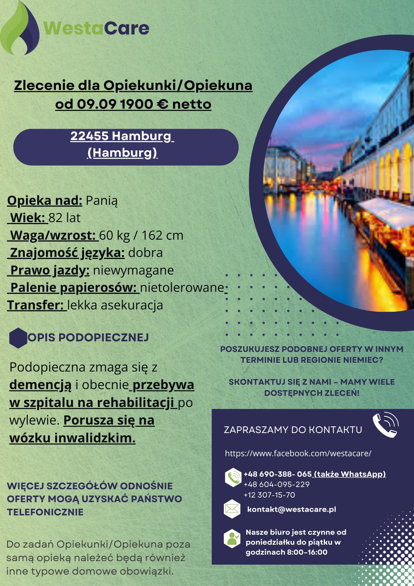 Zlecenie dla Opiekunki/Opiekuna od 09.09 1900 € netto
