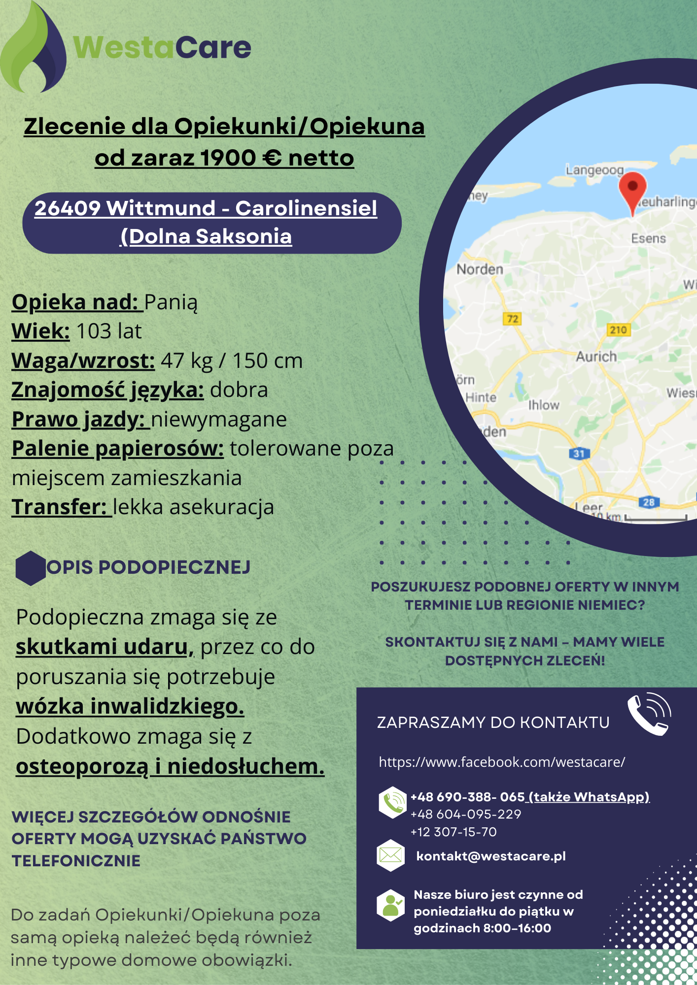 Pani mieszka sama w 26409 Wittmund – Carolinensiel, malowniczej miejscowości nad Morzem Północnym, znanej z pięknych plaż, klimatycznych uliczek i spokojnej atmosfery. W centrum znajdują się sklepy spożywcze, piekarnia, apteka oraz inne punkty usługowe, które zapewniają dostęp do codziennych potrzeb. Większe zakupy oraz dodatkowe atrakcje można zrealizować w pobliskich miastach, takich jak Wittmund czy Esens, oddalonych zaledwie kilka kilometrów. Dla Opiekuna lub Opiekunki przygotowano komfortowy, w pełni wyposażony pokój gościnny z dostępem do internetu.