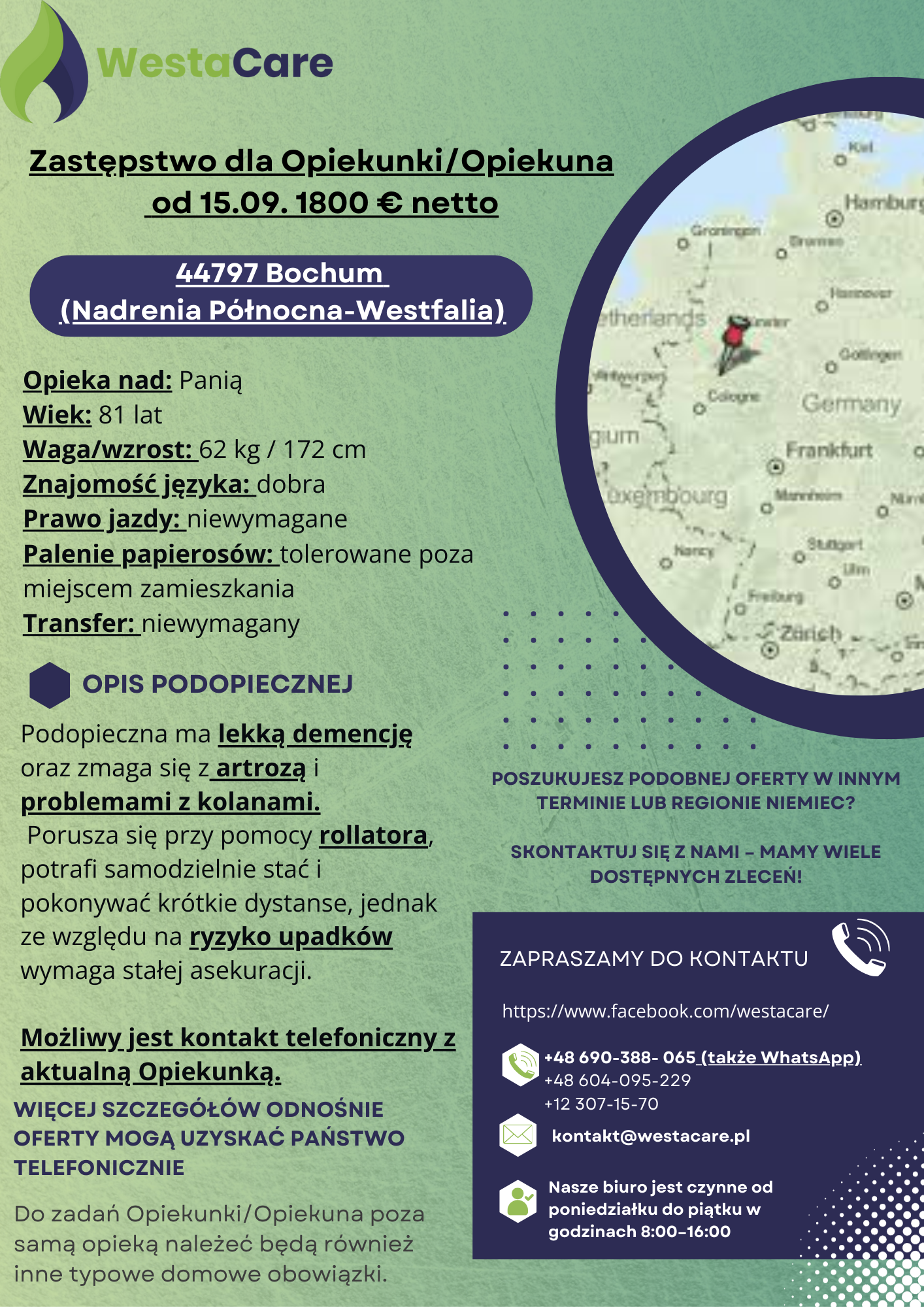 Zastępstwo dla Opiekunki/Opiekuna od 15.09. 1800 € netto